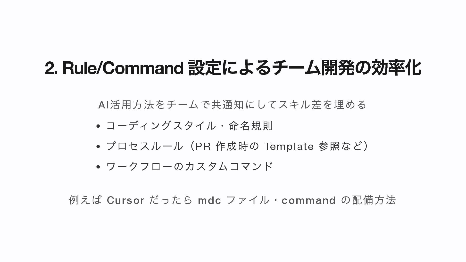 2. Rule/Command 設定によるチーム開発の効率化 AI 活用方法をチームで共通知にしてスキル差を埋める コーディングスタイル・命名規則 プロセスルール(PR 作成時の Template 参照など)