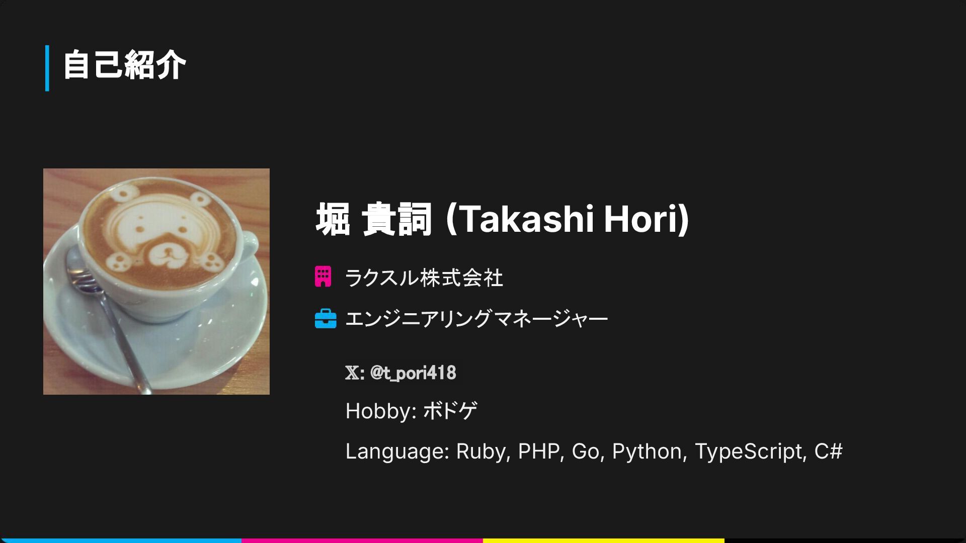 自己紹介 堀 貴詞 Takashi Hori) ラクスル株式会社 エンジニアリングマネージャー 𝕏: @t_pori418