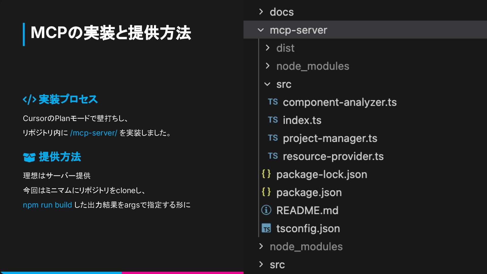 MCPの実装と提供方法 実装プロセス CursorのPlanモードで壁打ちし、 リポジトリ内に /mcp-server/ を実装しました。 提供方法 理想はサーバー提供 今回はミニマムにリポジトリをcloneし、 npm