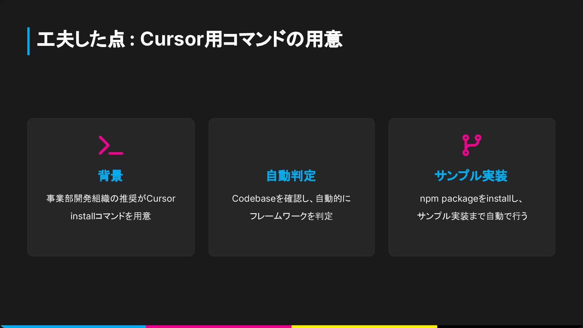 工夫した点 : Cursor用コマンドの用意 背景 事業部開発組織の推奨がCursor installコマンドを用意 自動判定 Codebaseを確認し、自動的に フレームワークを判定 サンプル実装