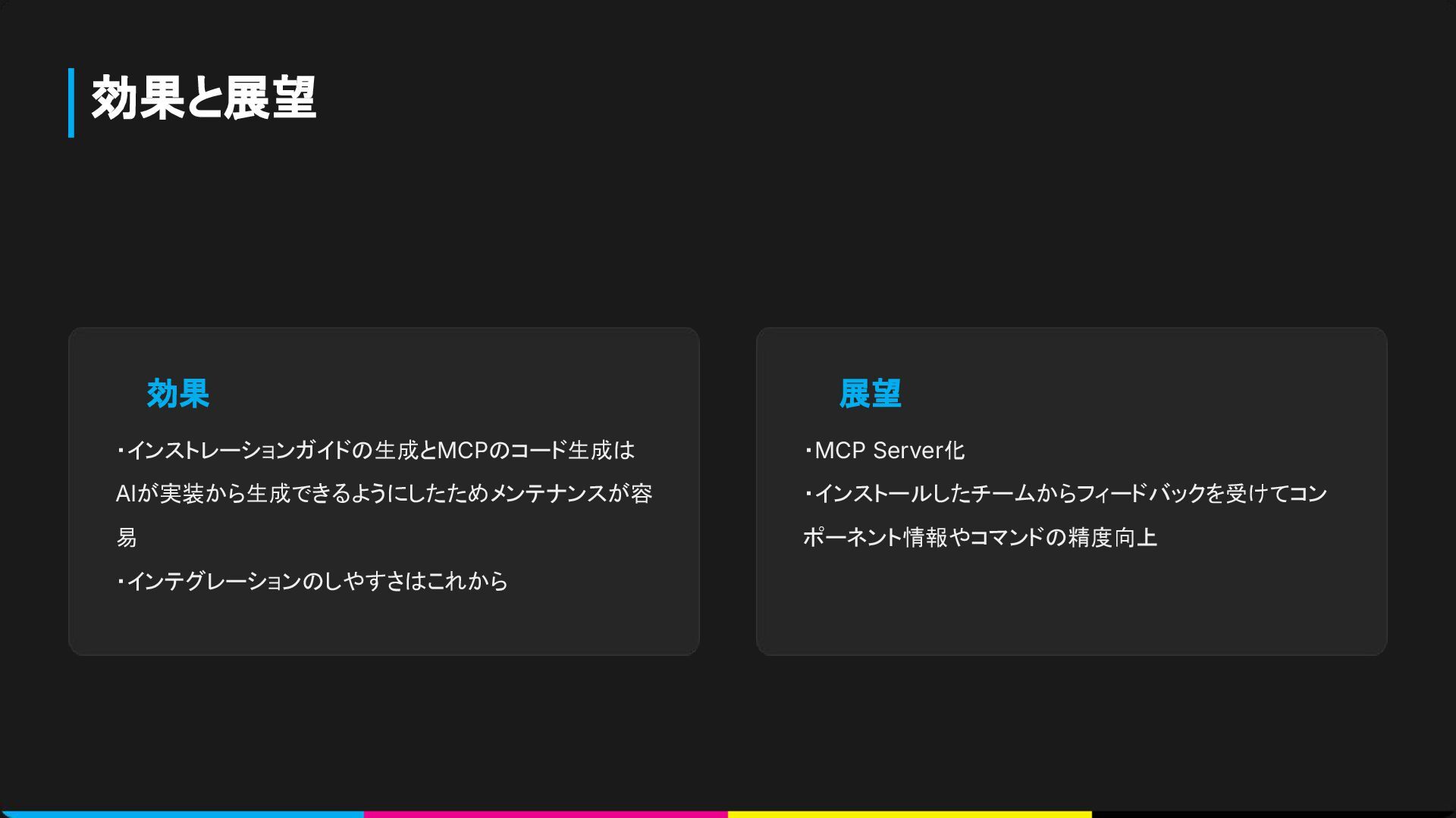 効果と展望 効果 ・インストレーションガイドの生成とMCPのコード生成は AIが実装から生成できるようにしたためメンテナンスが容 易 ・インテグレーションのしやすさはこれから 展望 ・MCP Server化 ・インストールしたチームからフィードバックを受けてコン