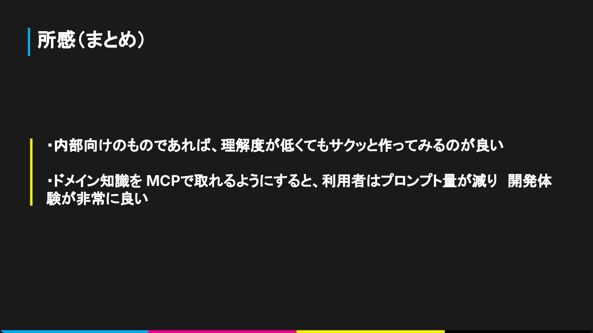 所感(まとめ) ・内部向けのものであれば、理解度が低くてもサクッと作ってみるのが良い ・ドメイン知識を MCPで取れるようにすると、利用者はプロンプト量が減り 開発体 験が非常に良い
