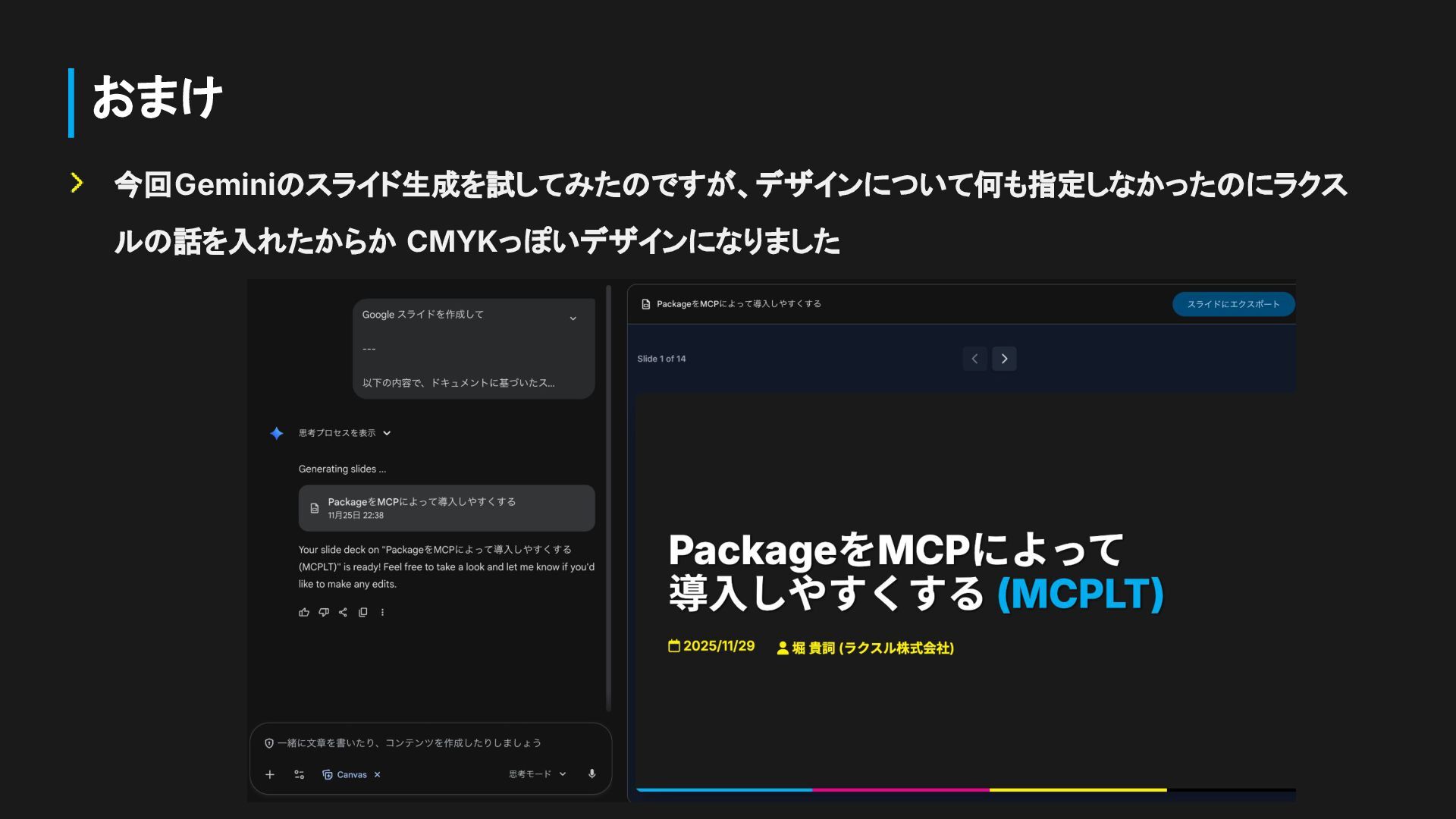 おまけ 今回Geminiのスライド生成を試してみたのですが、デザインについて何も指定しなかったのにラクス ルの話を入れたからか CMYKっぽいデザインになりました