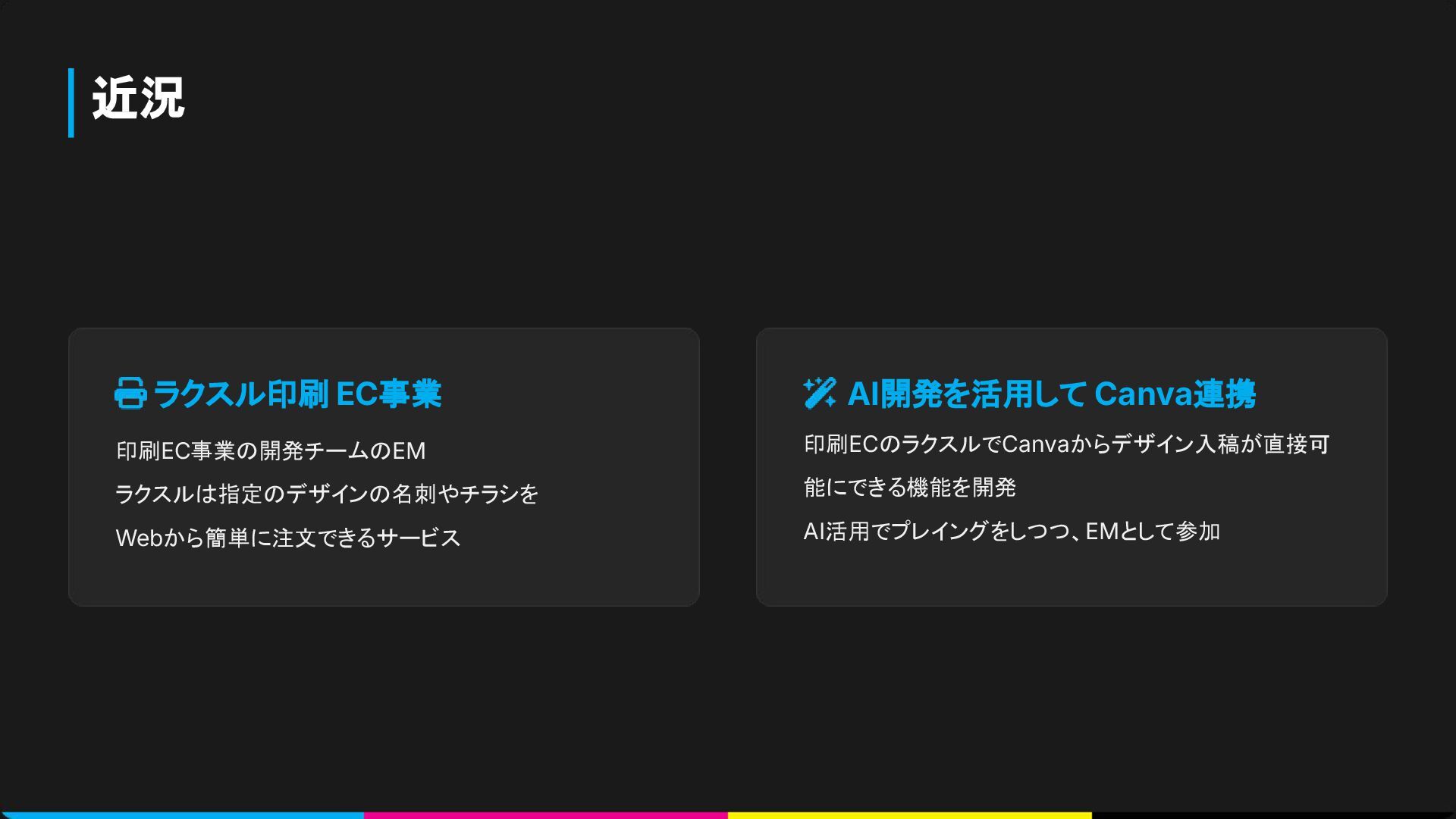 近況 ラクスル印刷 EC事業 印刷EC事業の開発チームのEM ラクスルは指定のデザインの名刺やチラシを Webから簡単に注文できるサービス AI開発を活用して Canva連携 印刷ECのラクスルでCanvaからデザイン入稿が直接可 能にできる機能を開発
