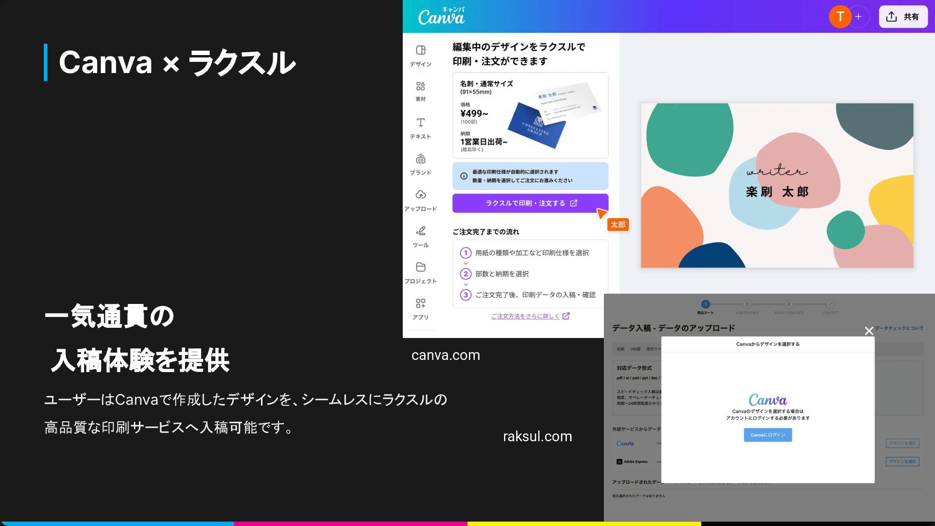 Canva × ラクスル 一気通貫の 入稿体験を提供 ユーザーはCanvaで作成したデザインを、シームレスにラクスルの 高品質な印刷サービスへ入稿可能です。 canva.com raksul.com
