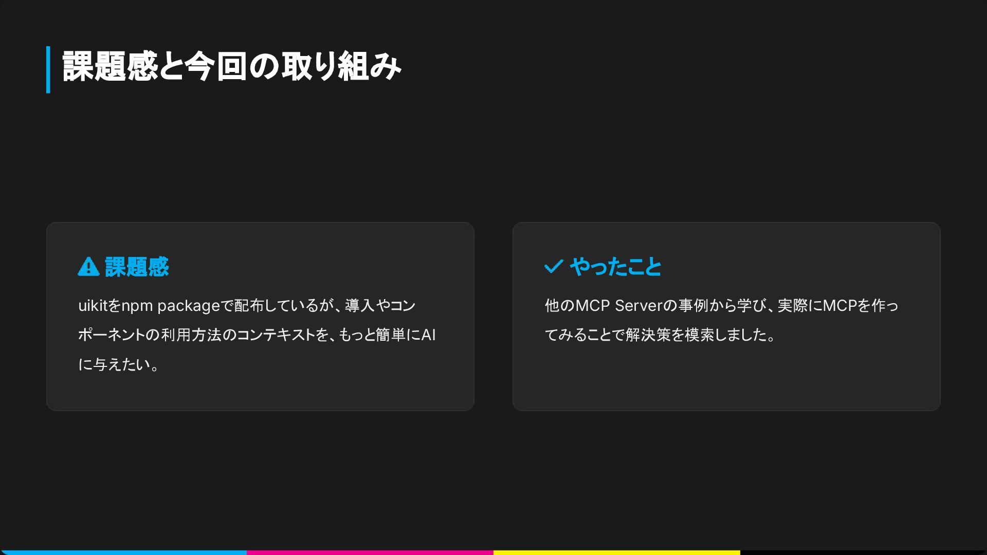 課題感と今回の取り組み 課題感 uikitをnpm packageで配布しているが、導入やコン ポーネントの利用方法のコンテキストを、もっと簡単にAI に与えたい。 やったこと 他のMCP Serverの事例から学び、実際にMCPを作っ てみることで解決策を模索しました。