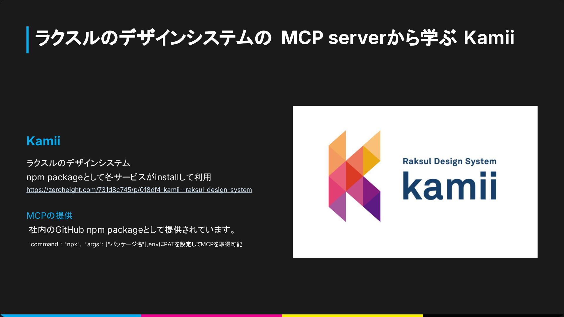 ラクスルのデザインシステムの MCP serverから学ぶ Kamii Kamii ラクスルのデザインシステム npm packageとして各サービスがinstallして利用 https://zeroheight.com/731d8c745/p/018df4-kamii--raksul-design-system MCPの提供