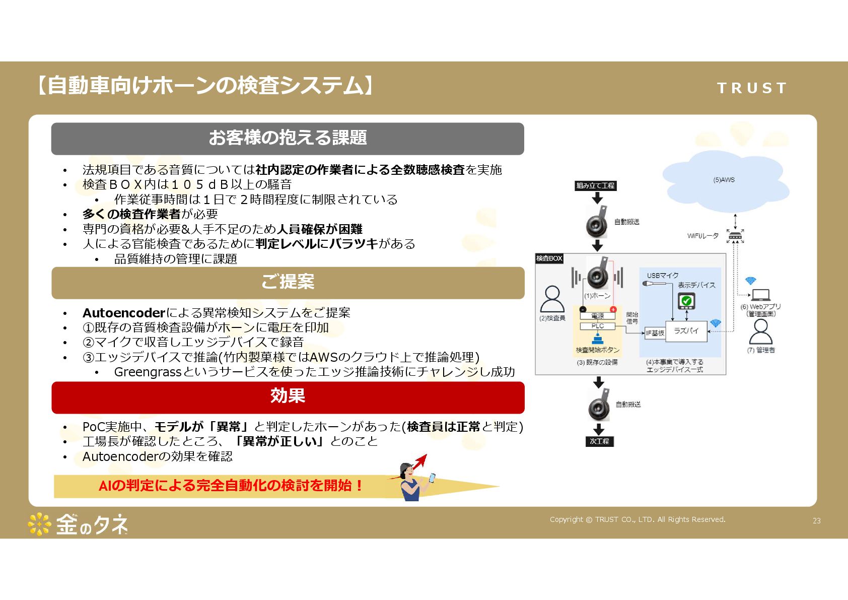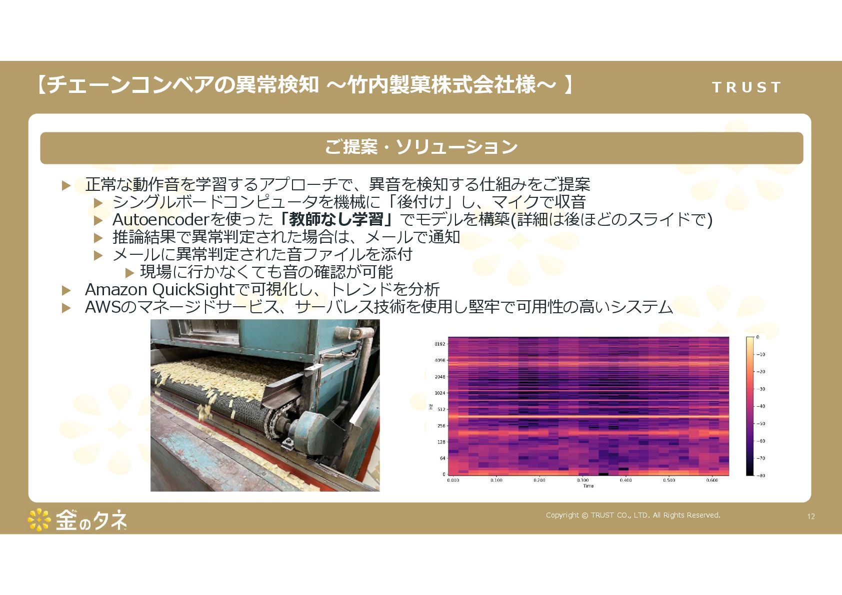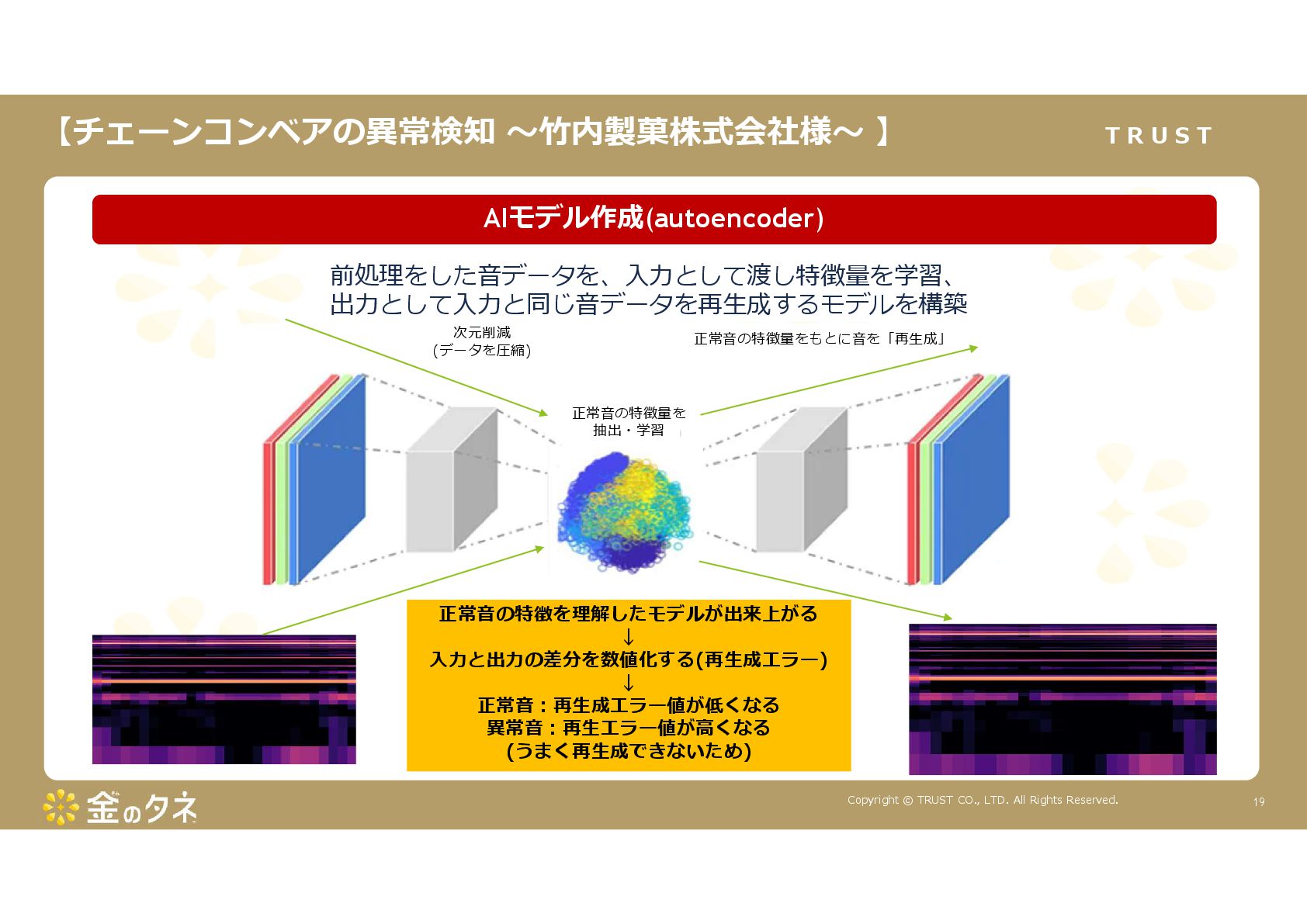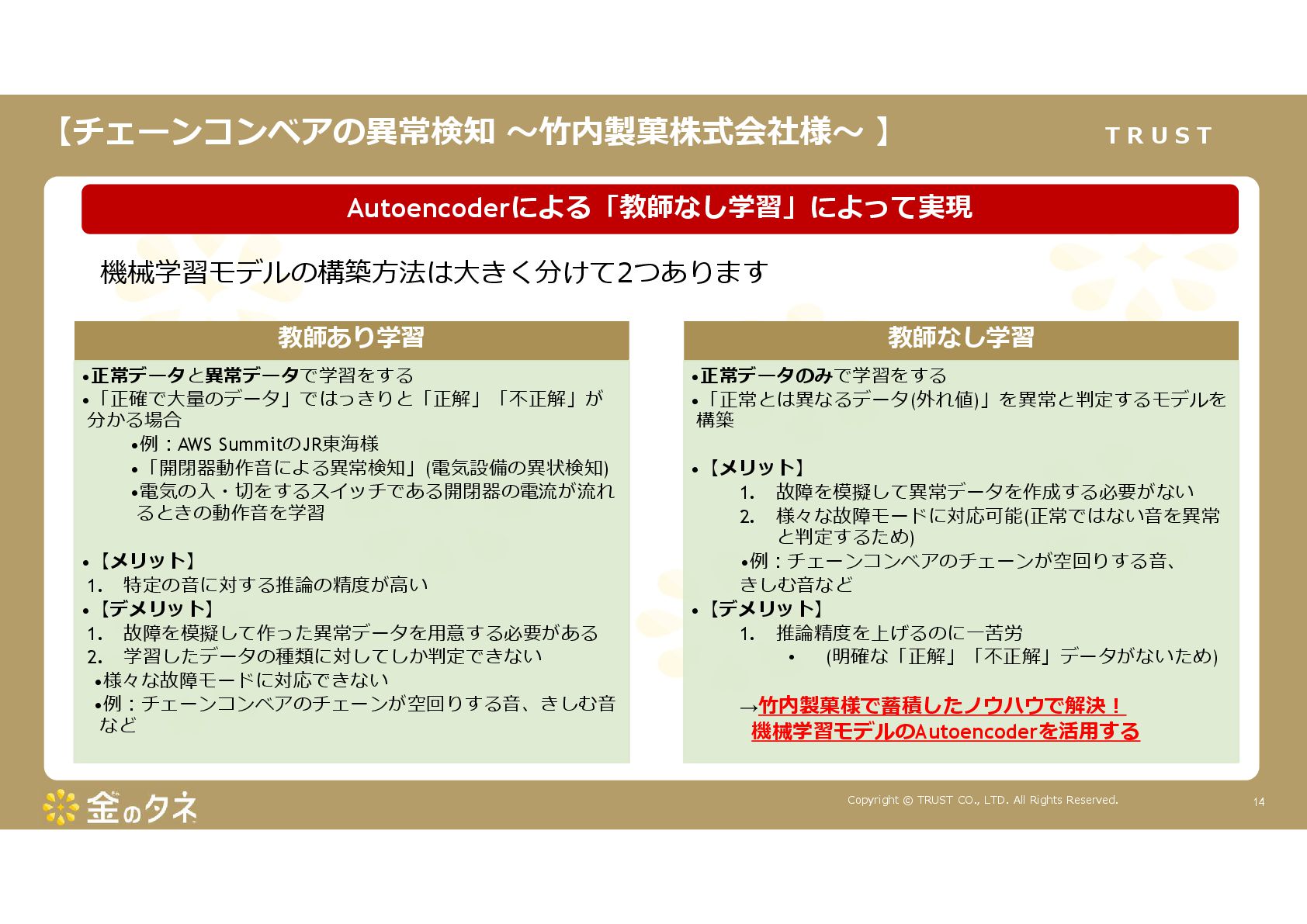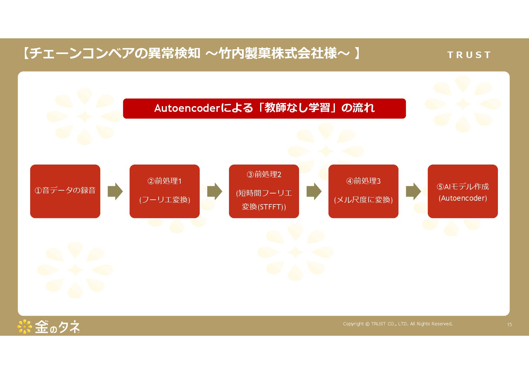 TRUST CO., LTD. All Rights Reserved. 14 教師あり学習 •正常データと異常データで学習をする •「正確で大量のデータ」ではっきりと「正解」「不正解」が 分かる場合 •例:AWS SummitのJR東海様 •「開閉器動作音による異常検知」(電気設備の異状検知) •電気の入・切をするスイッチである開閉器の電流が流れ るときの動作音を学習 •【メリット】 1. 特定の音に対する推論の精度が高い •【デメリット】 1. 故障を模擬して作った異常データを用意する必要がある 2. 学習したデータの種類に対してしか判定できない •様々な故障モードに対応できない •例:チェーンコンベアのチェーンが空回りする音、きしむ音 など 教師なし学習 •正常データのみで学習をする •「正常とは異なるデータ(外れ値)」を異常と判定するモデルを 構築 •【メリット】 1. 故障を模擬して異常データを作成する必要がない 2. 様々な故障モードに対応可能(正常ではない音を異常 と判定するため) •例:チェーンコンベアのチェーンが空回りする音、 きしむ音など •【デメリット】 1. 推論精度を上げるのに一苦労 • (明確な「正解」「不正解」データがないため) →竹内製菓様で蓄積したノウハウで解決! 機械学習モデルのAutoencoderを活用する Autoencoderによる「教師なし学習」によって実現 機械学習モデルの構築方法は大きく分けて2つあります