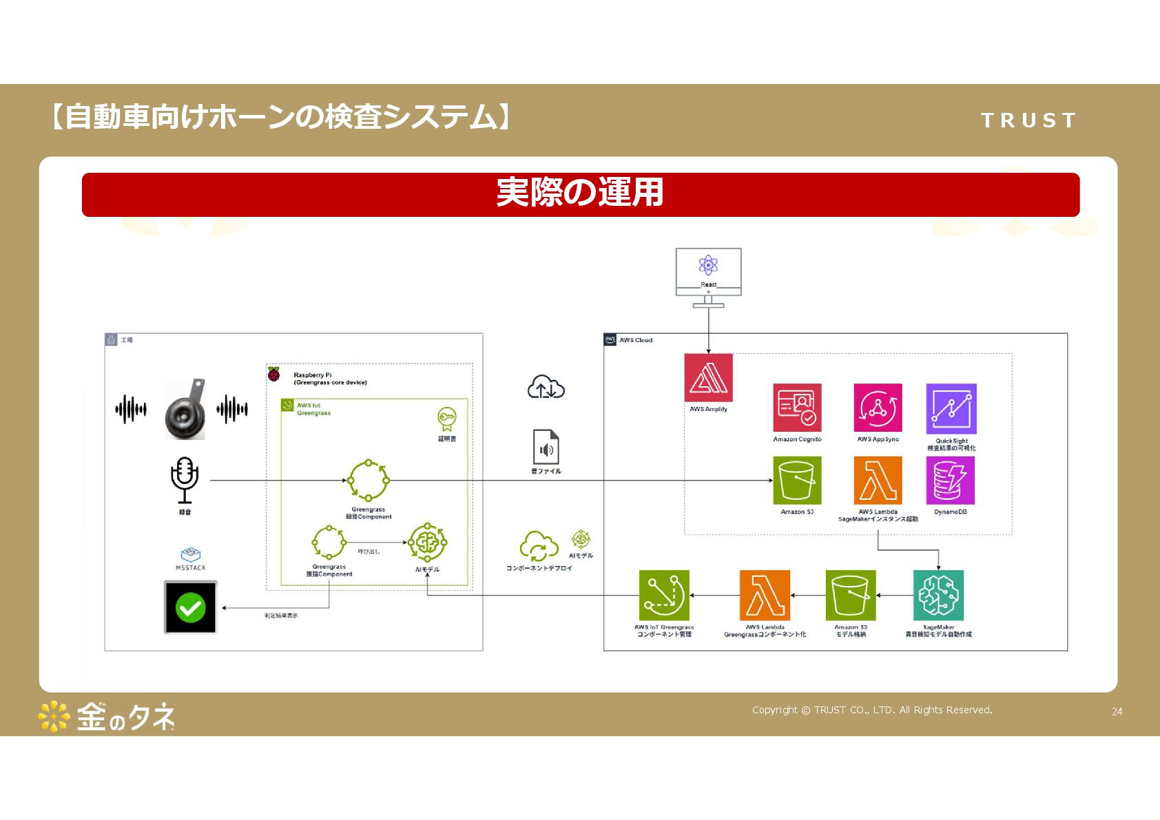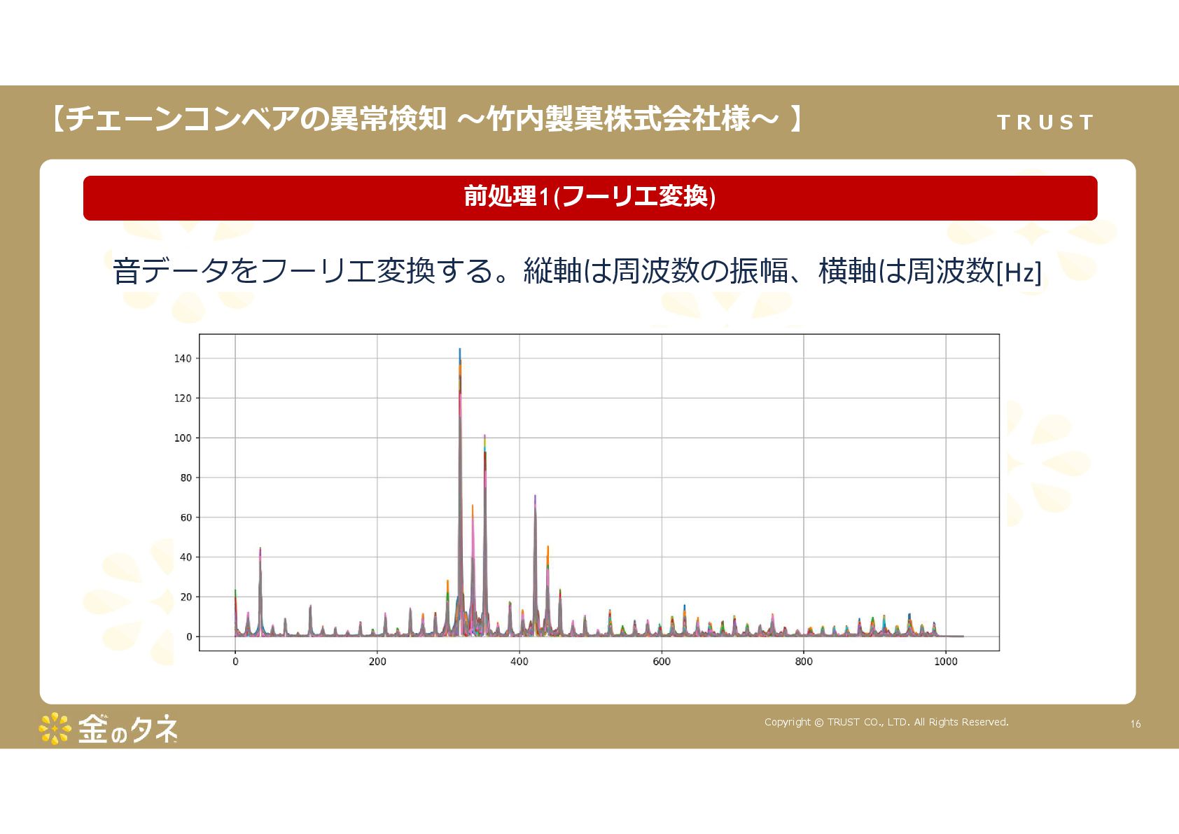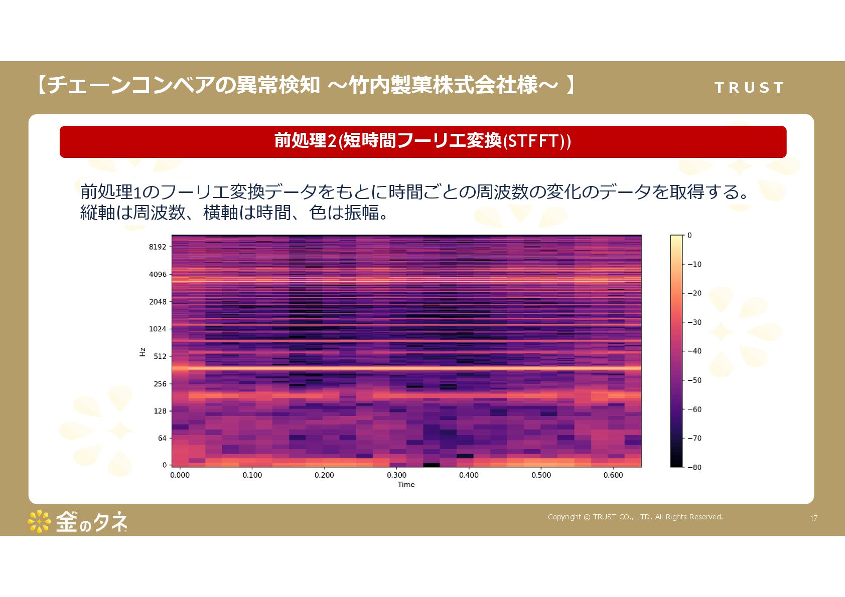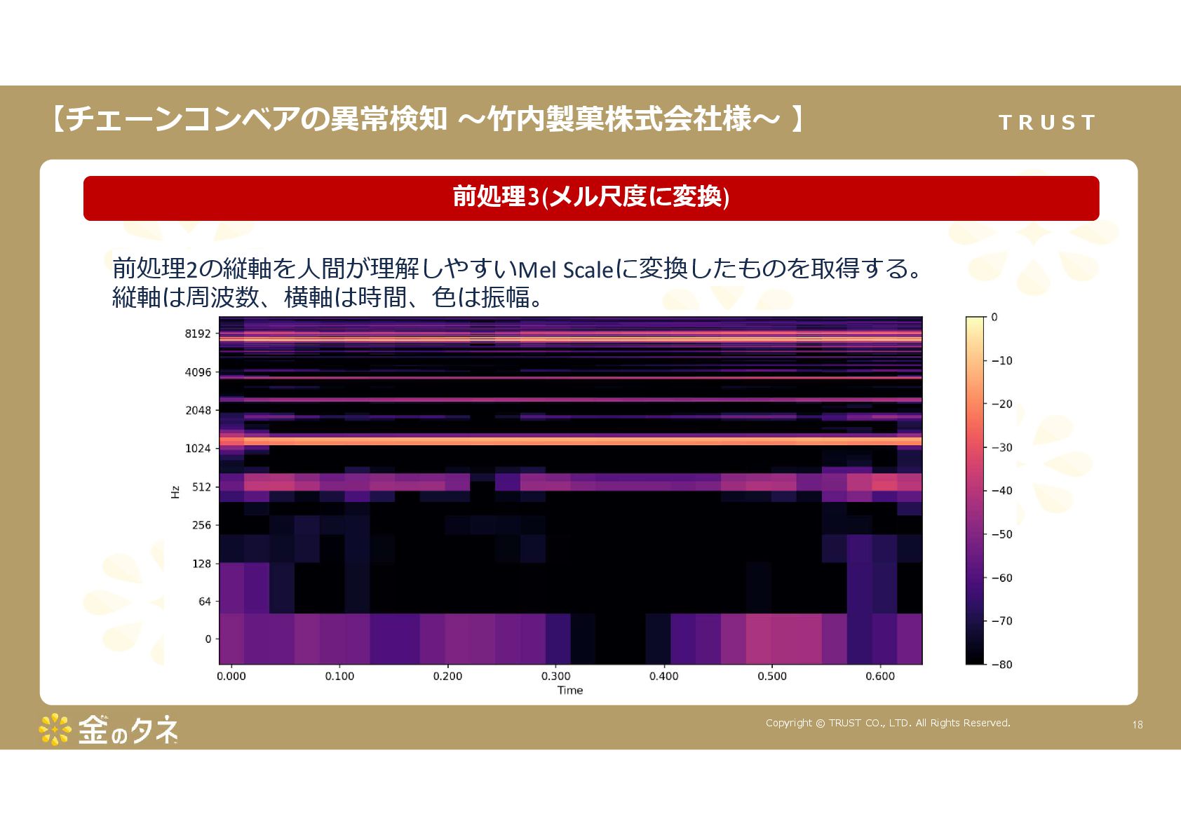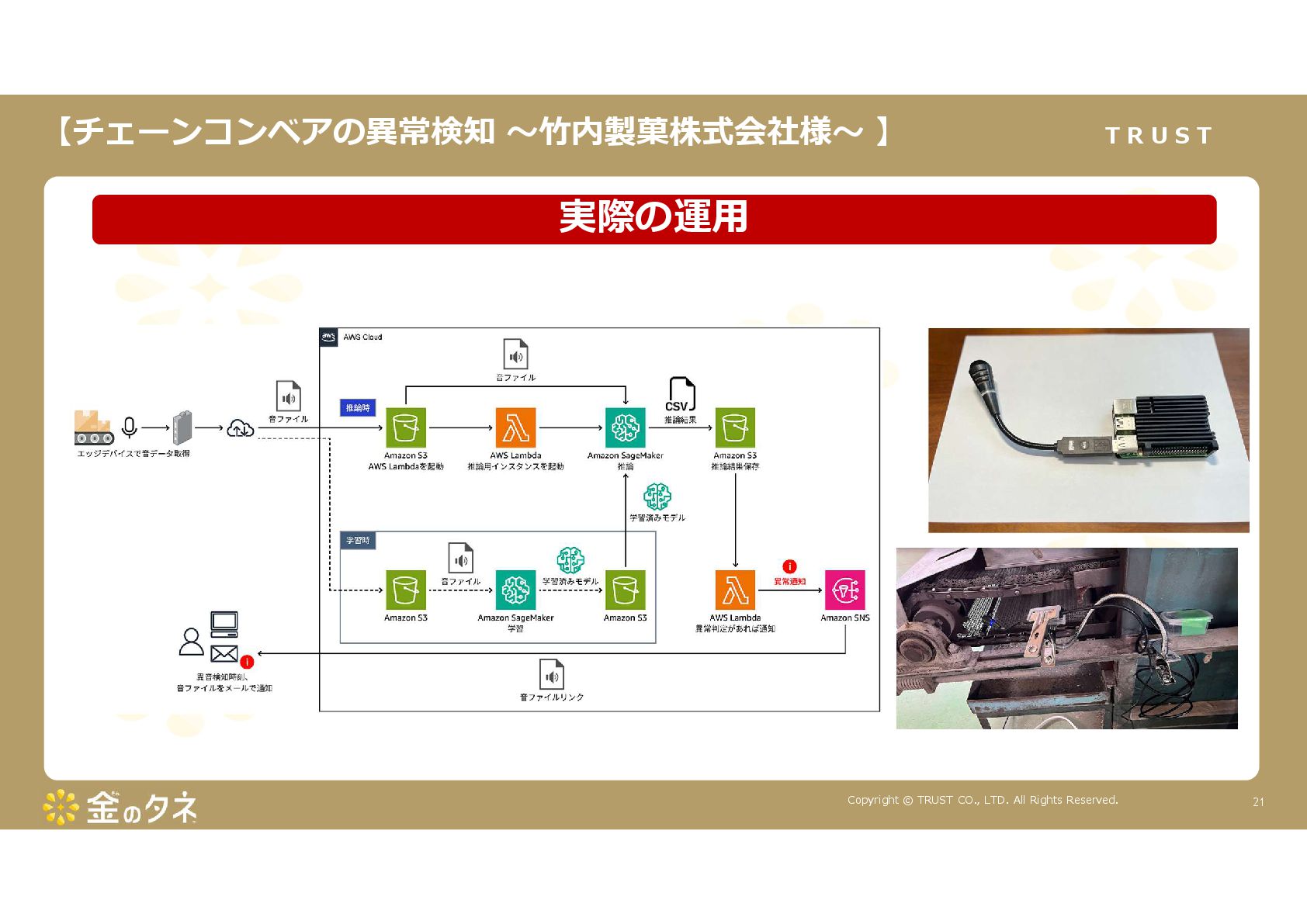 TRUST CO., LTD. All Rights Reserved. 14 教師あり学習 •正常データと異常データで学習をする •「正確で大量のデータ」ではっきりと「正解」「不正解」が 分かる場合 •例:AWS SummitのJR東海様 •「開閉器動作音による異常検知」(電気設備の異状検知) •電気の入・切をするスイッチである開閉器の電流が流れ るときの動作音を学習 •【メリット】 1. 特定の音に対する推論の精度が高い •【デメリット】 1. 故障を模擬して作った異常データを用意する必要がある 2. 学習したデータの種類に対してしか判定できない •様々な故障モードに対応できない •例:チェーンコンベアのチェーンが空回りする音、きしむ音 など 教師なし学習 •正常データのみで学習をする •「正常とは異なるデータ(外れ値)」を異常と判定するモデルを 構築 •【メリット】 1. 故障を模擬して異常データを作成する必要がない 2. 様々な故障モードに対応可能(正常ではない音を異常 と判定するため) •例:チェーンコンベアのチェーンが空回りする音、 きしむ音など •【デメリット】 1. 推論精度を上げるのに一苦労 • (明確な「正解」「不正解」データがないため) →竹内製菓様で蓄積したノウハウで解決! 機械学習モデルのAutoencoderを活用する Autoencoderによる「教師なし学習」によって実現 機械学習モデルの構築方法は大きく分けて2つあります