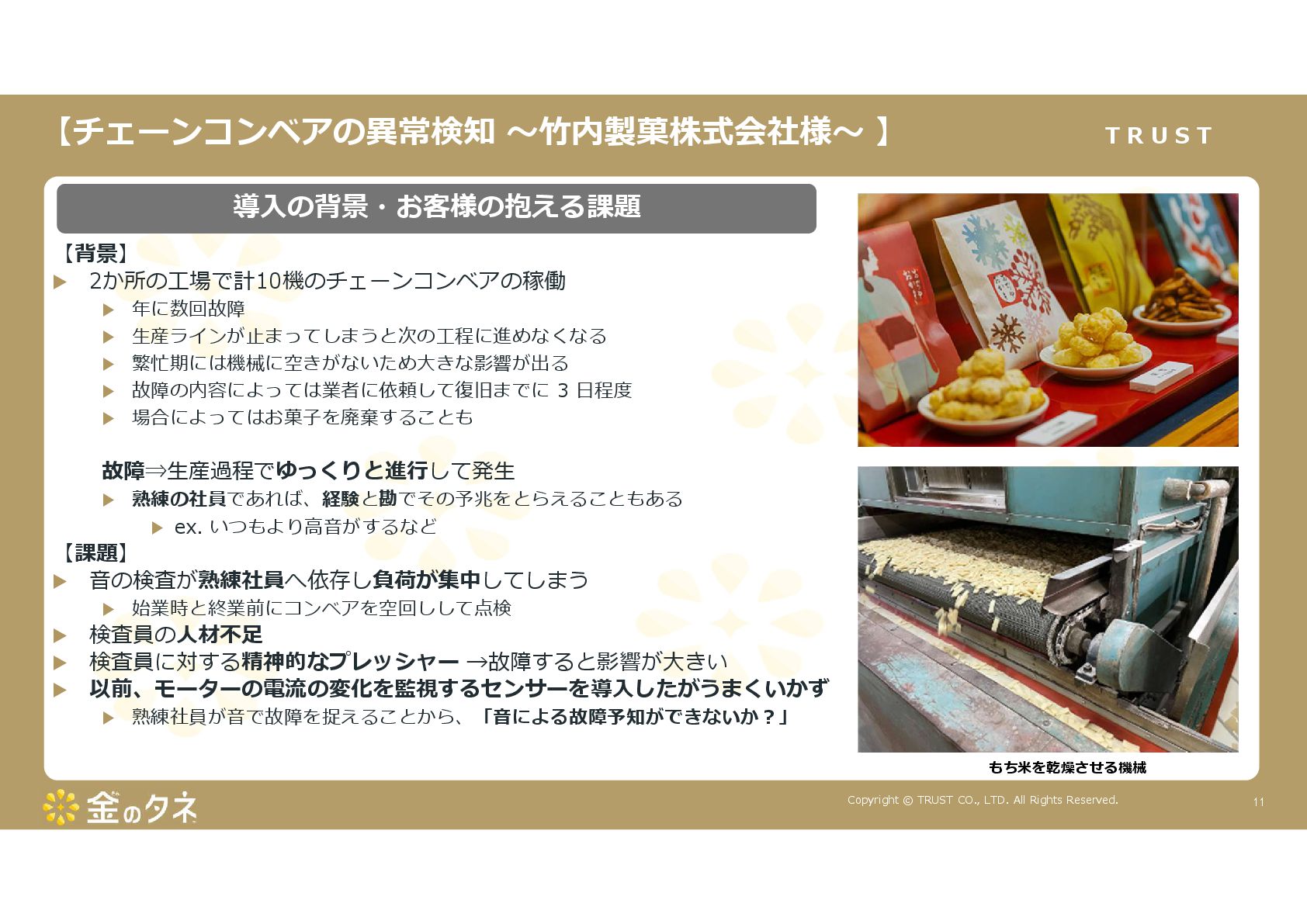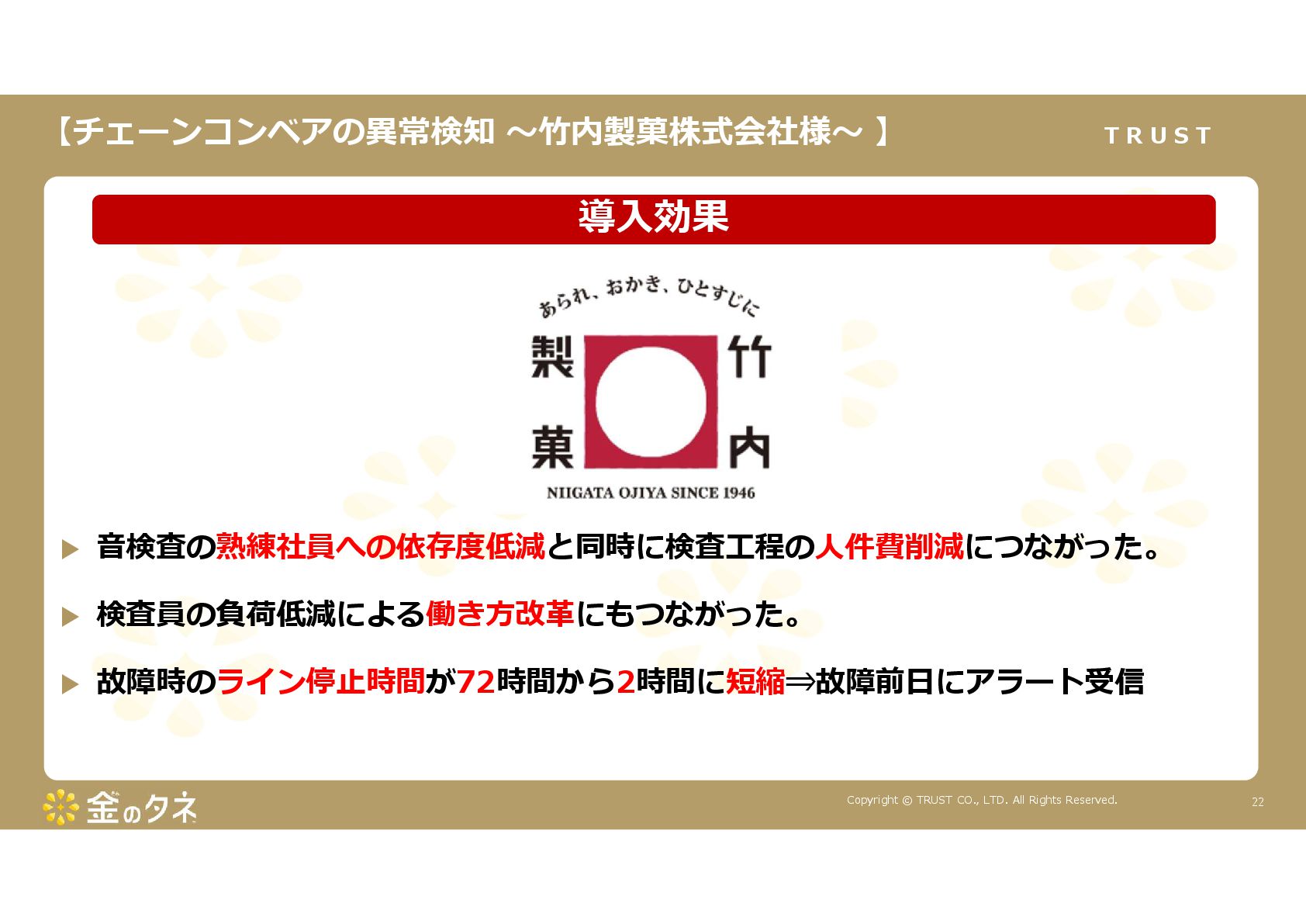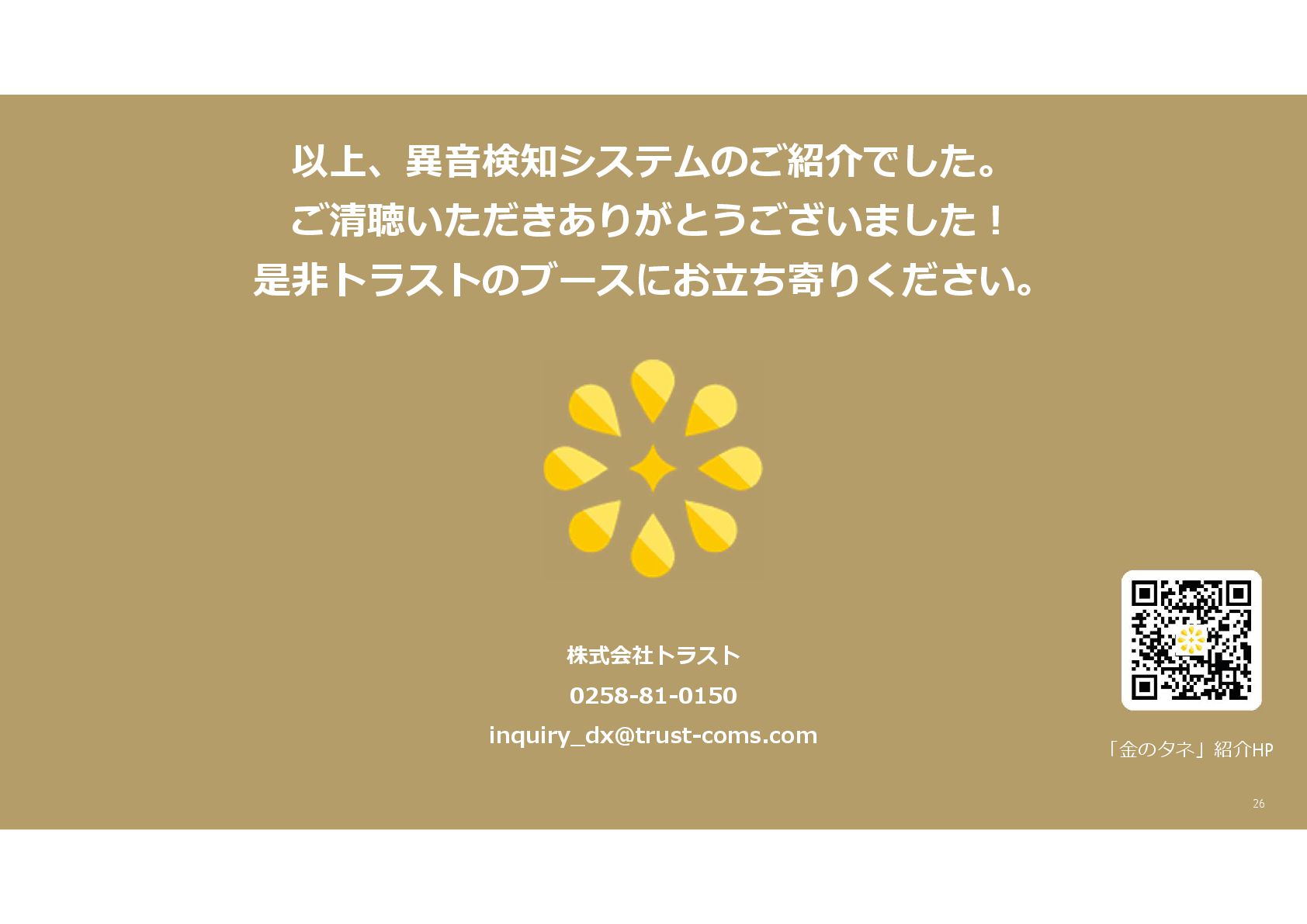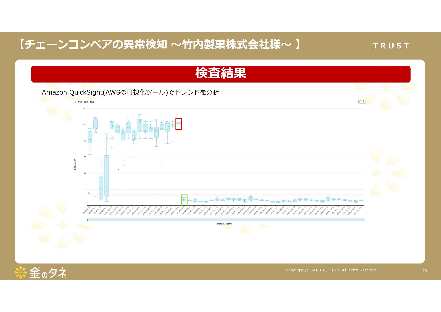 TRUST CO., LTD. All Rights Reserved. 14 教師あり学習 •正常データと異常データで学習をする •「正確で大量のデータ」ではっきりと「正解」「不正解」が 分かる場合 •例:AWS SummitのJR東海様 •「開閉器動作音による異常検知」(電気設備の異状検知) •電気の入・切をするスイッチである開閉器の電流が流れ るときの動作音を学習 •【メリット】 1. 特定の音に対する推論の精度が高い •【デメリット】 1. 故障を模擬して作った異常データを用意する必要がある 2. 学習したデータの種類に対してしか判定できない •様々な故障モードに対応できない •例:チェーンコンベアのチェーンが空回りする音、きしむ音 など 教師なし学習 •正常データのみで学習をする •「正常とは異なるデータ(外れ値)」を異常と判定するモデルを 構築 •【メリット】 1. 故障を模擬して異常データを作成する必要がない 2. 様々な故障モードに対応可能(正常ではない音を異常 と判定するため) •例:チェーンコンベアのチェーンが空回りする音、 きしむ音など •【デメリット】 1. 推論精度を上げるのに一苦労 • (明確な「正解」「不正解」データがないため) →竹内製菓様で蓄積したノウハウで解決! 機械学習モデルのAutoencoderを活用する Autoencoderによる「教師なし学習」によって実現 機械学習モデルの構築方法は大きく分けて2つあります