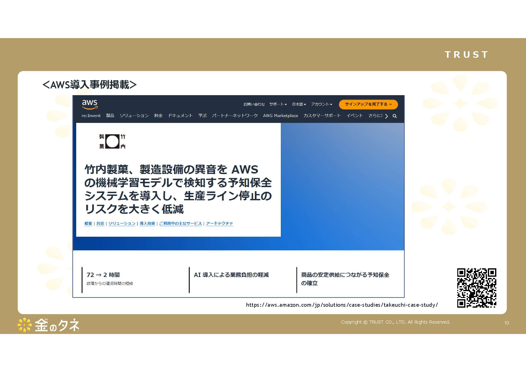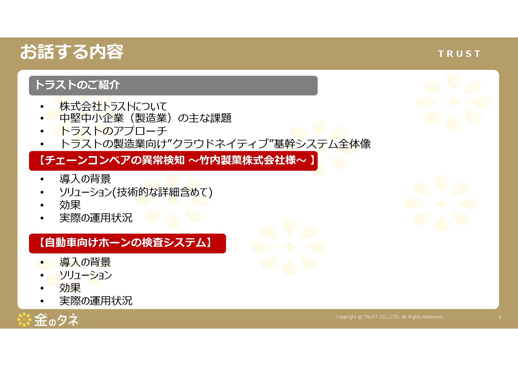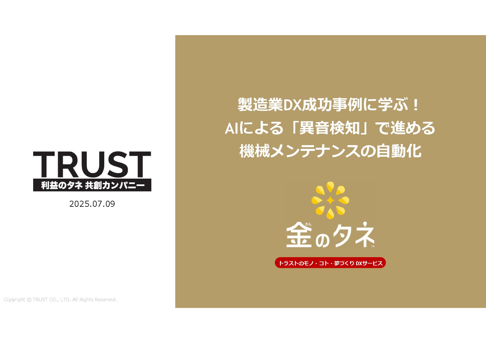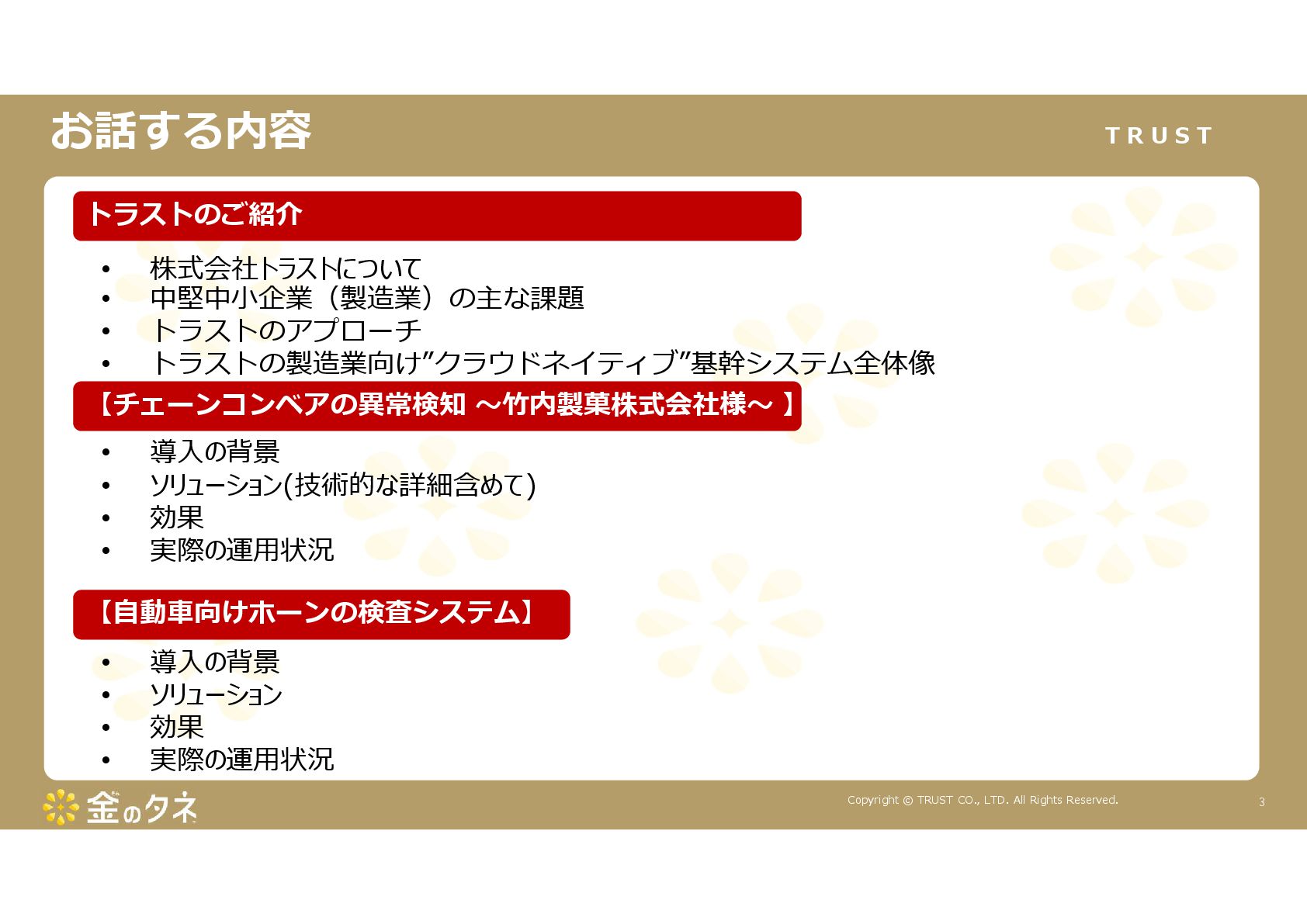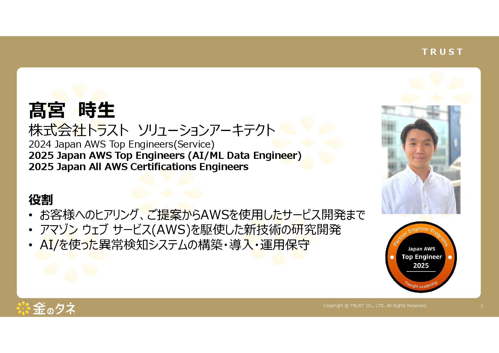 TRUST CO., LTD. All Rights Reserved. 14 教師あり学習 •正常データと異常データで学習をする •「正確で大量のデータ」ではっきりと「正解」「不正解」が 分かる場合 •例:AWS SummitのJR東海様 •「開閉器動作音による異常検知」(電気設備の異状検知) •電気の入・切をするスイッチである開閉器の電流が流れ るときの動作音を学習 •【メリット】 1. 特定の音に対する推論の精度が高い •【デメリット】 1. 故障を模擬して作った異常データを用意する必要がある 2. 学習したデータの種類に対してしか判定できない •様々な故障モードに対応できない •例:チェーンコンベアのチェーンが空回りする音、きしむ音 など 教師なし学習 •正常データのみで学習をする •「正常とは異なるデータ(外れ値)」を異常と判定するモデルを 構築 •【メリット】 1. 故障を模擬して異常データを作成する必要がない 2. 様々な故障モードに対応可能(正常ではない音を異常 と判定するため) •例:チェーンコンベアのチェーンが空回りする音、 きしむ音など •【デメリット】 1. 推論精度を上げるのに一苦労 • (明確な「正解」「不正解」データがないため) →竹内製菓様で蓄積したノウハウで解決! 機械学習モデルのAutoencoderを活用する Autoencoderによる「教師なし学習」によって実現 機械学習モデルの構築方法は大きく分けて2つあります