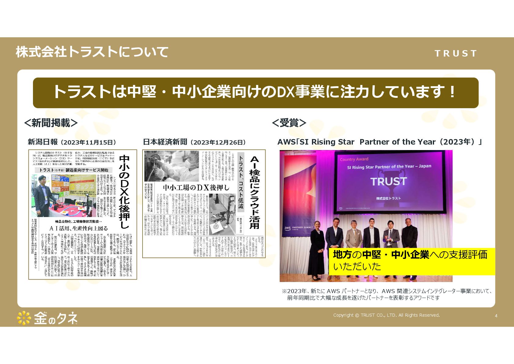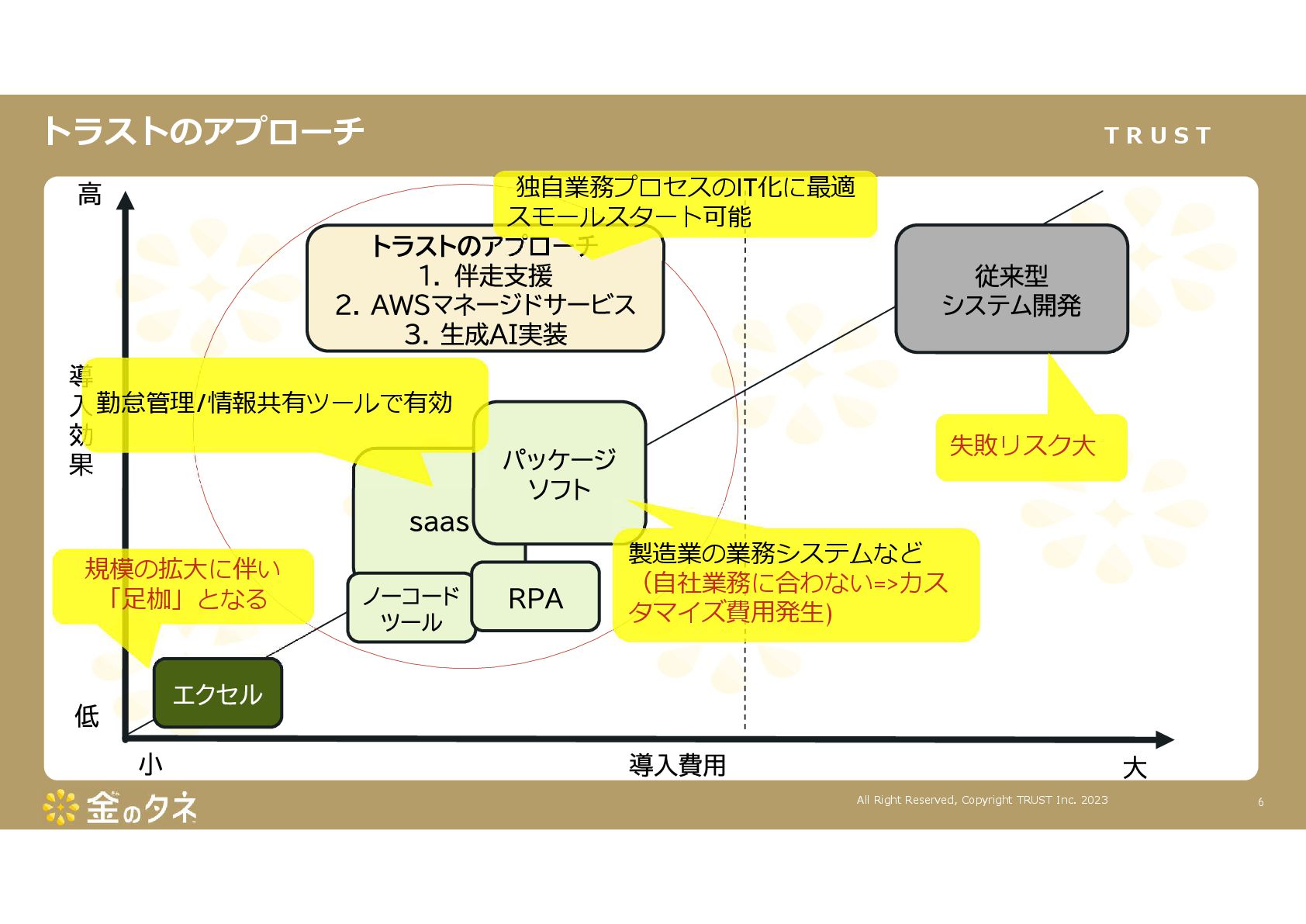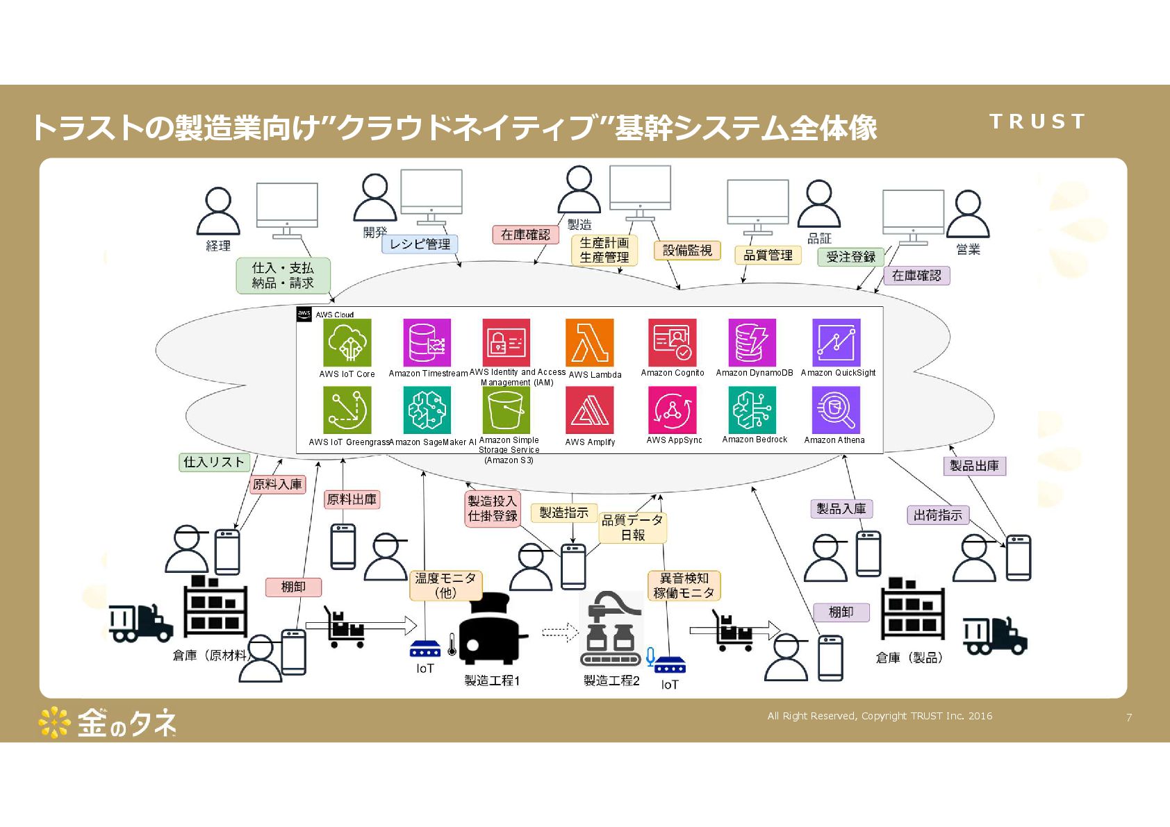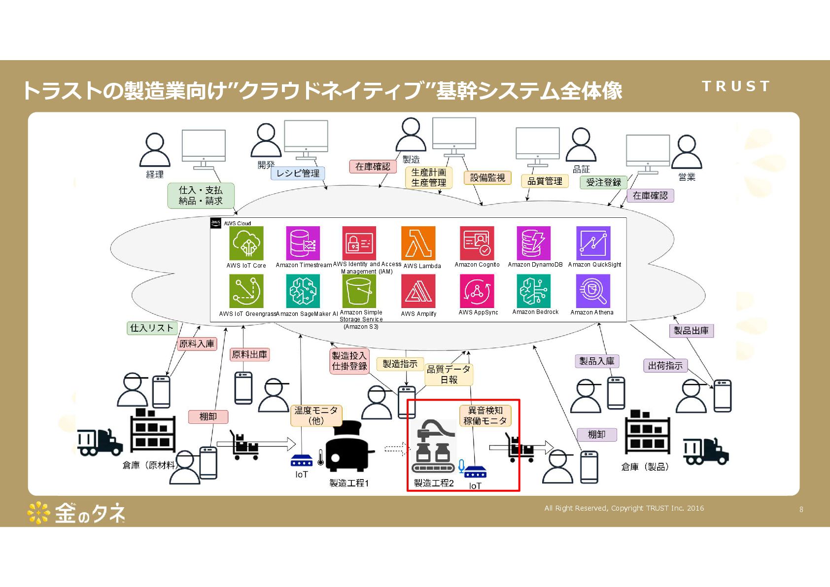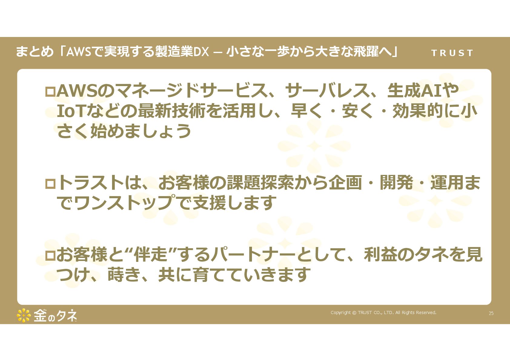 TRUST CO., LTD. All Rights Reserved. 14 教師あり学習 •正常データと異常データで学習をする •「正確で大量のデータ」ではっきりと「正解」「不正解」が 分かる場合 •例:AWS SummitのJR東海様 •「開閉器動作音による異常検知」(電気設備の異状検知) •電気の入・切をするスイッチである開閉器の電流が流れ るときの動作音を学習 •【メリット】 1. 特定の音に対する推論の精度が高い •【デメリット】 1. 故障を模擬して作った異常データを用意する必要がある 2. 学習したデータの種類に対してしか判定できない •様々な故障モードに対応できない •例:チェーンコンベアのチェーンが空回りする音、きしむ音 など 教師なし学習 •正常データのみで学習をする •「正常とは異なるデータ(外れ値)」を異常と判定するモデルを 構築 •【メリット】 1. 故障を模擬して異常データを作成する必要がない 2. 様々な故障モードに対応可能(正常ではない音を異常 と判定するため) •例:チェーンコンベアのチェーンが空回りする音、 きしむ音など •【デメリット】 1. 推論精度を上げるのに一苦労 • (明確な「正解」「不正解」データがないため) →竹内製菓様で蓄積したノウハウで解決! 機械学習モデルのAutoencoderを活用する Autoencoderによる「教師なし学習」によって実現 機械学習モデルの構築方法は大きく分けて2つあります