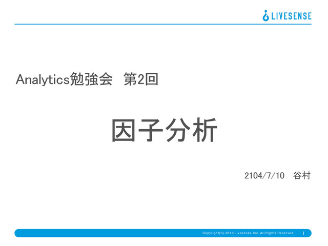 Reserved. 2 目次 1. 因子分析でやろうとしてること ① 解こうとしている問題 ② 利用場面 ③ 主成分分析との違い 2. 概念的な理解 ① 式の確認 ② 因子分析の仮定 ③ ざっくりした手順 3. 具体的な解法 ① 因子数の決定 ② 因子負荷の推定 ③ 質的因子分析 ④ 回転 ⑤ 因子スコアの推定
