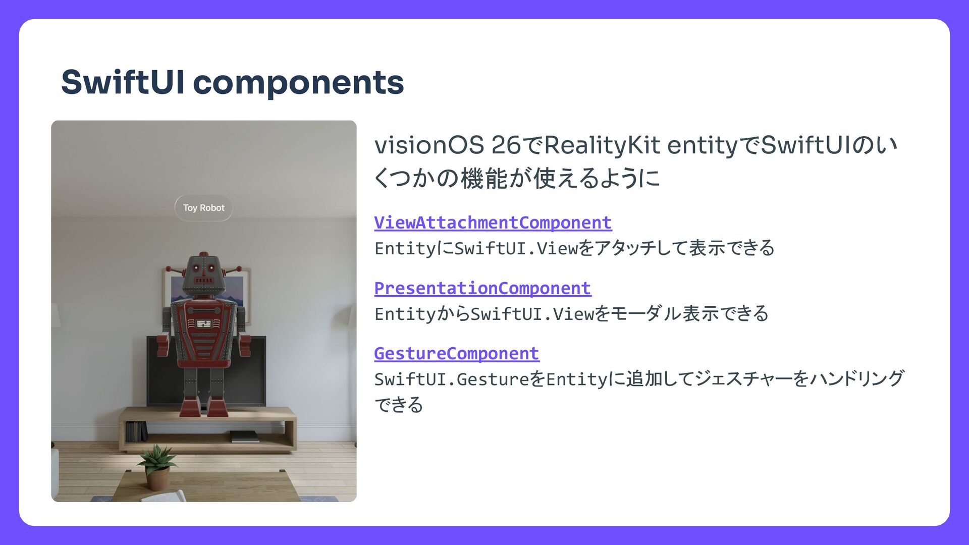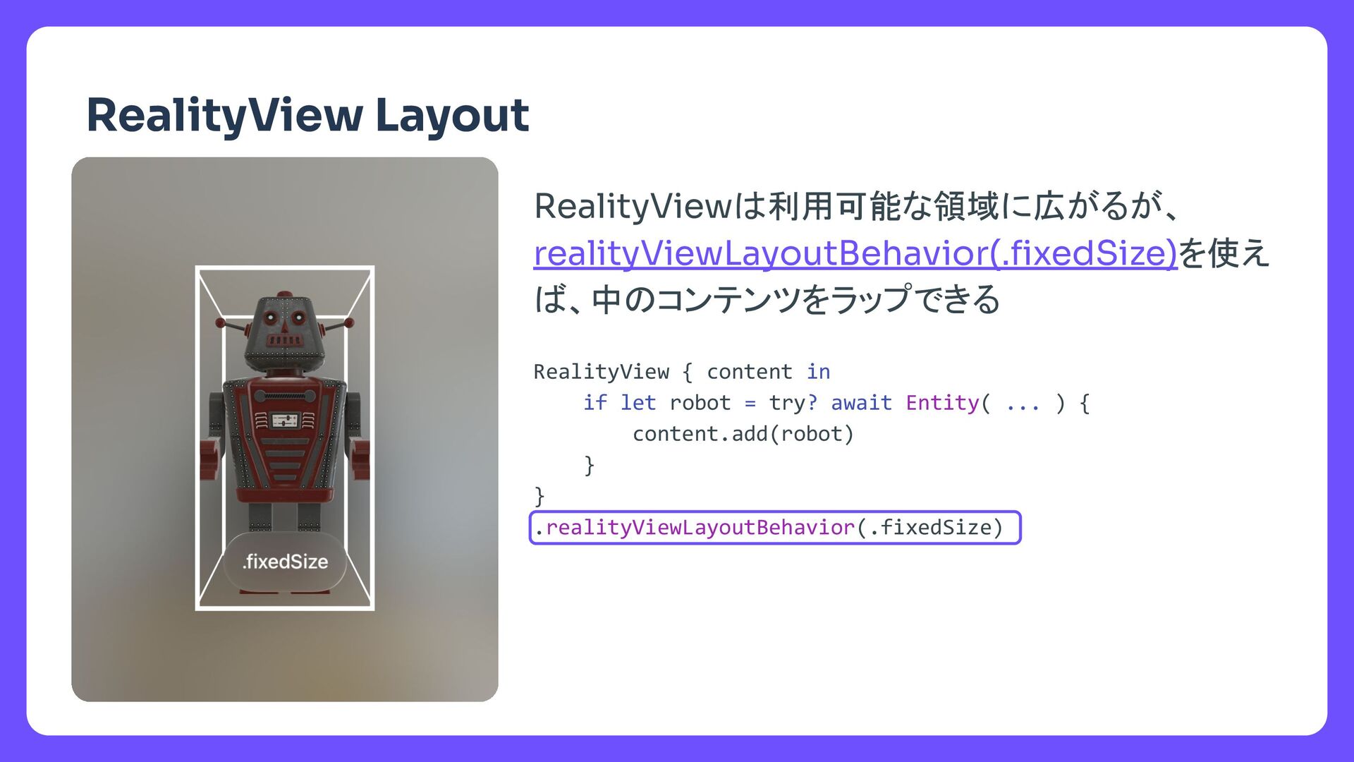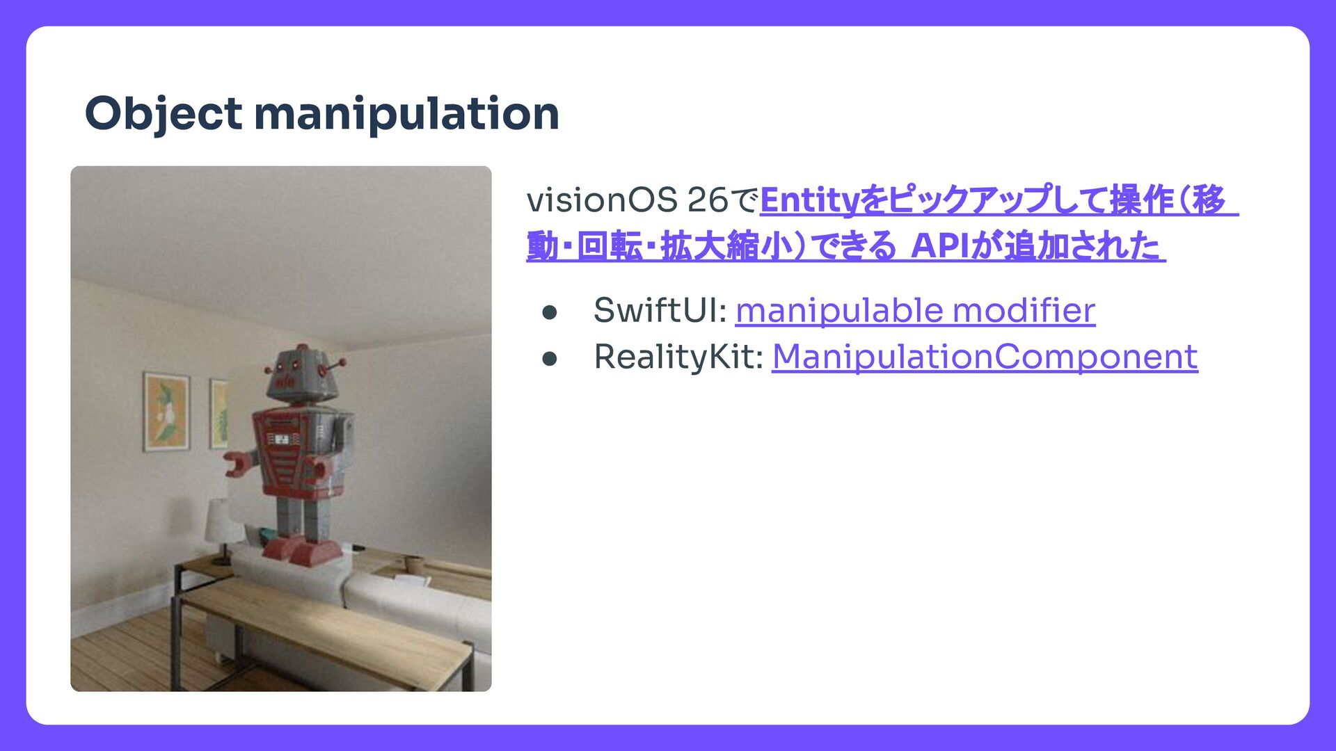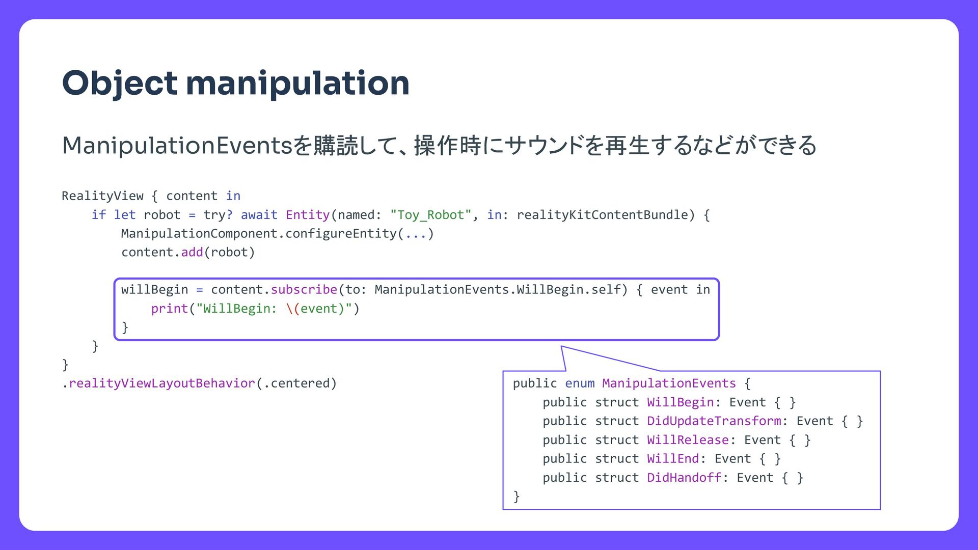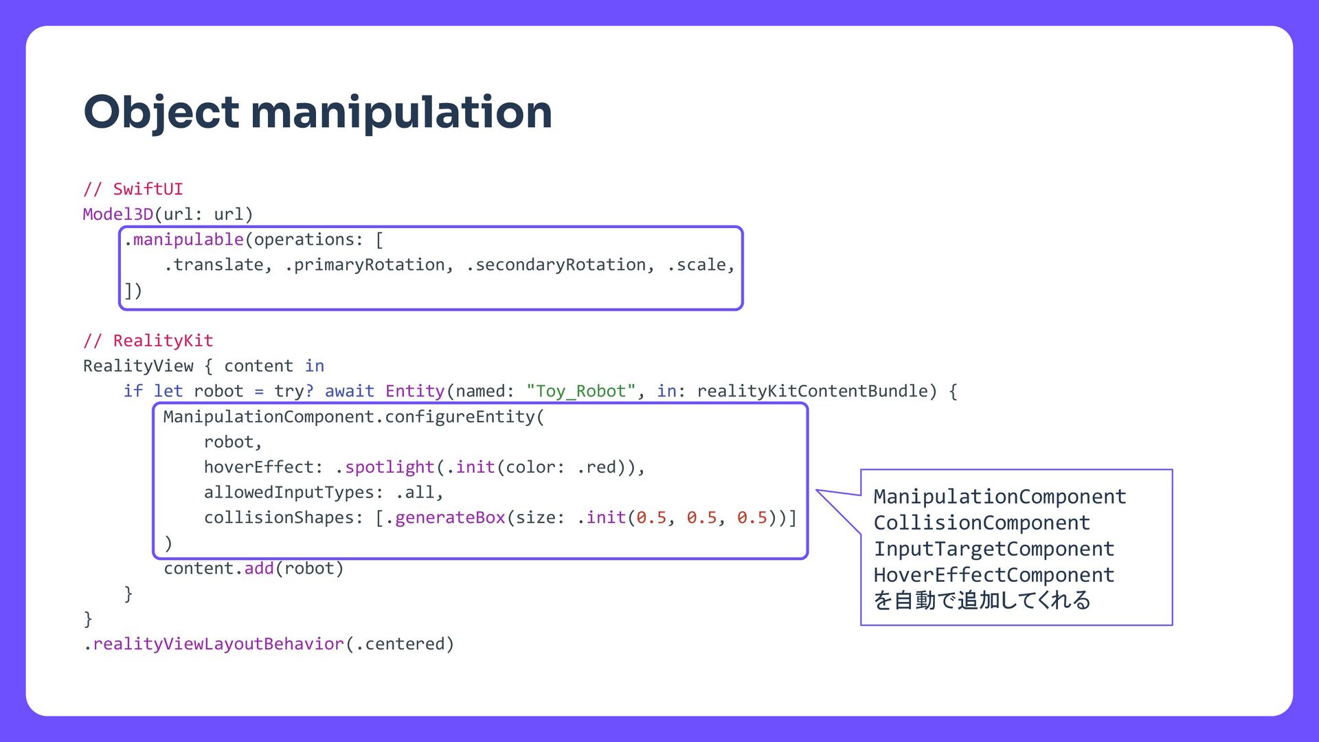 .primaryRotation, .secondaryRotation, .scale, ]) // RealityKit RealityView { content in if let robot = try? await Entity(named: "Toy_Robot", in: realityKitContentBundle) { ManipulationComponent.configureEntity( robot, hoverEffect: .spotlight(.init(color: .red)), allowedInputTypes: .all, collisionShapes: [.generateBox(size: .init(0.5, 0.5, 0.5))] ) content.add(robot) } } .realityViewLayoutBehavior(.centered) ManipulationComponent CollisionComponent InputTargetComponent HoverEffectComponent を自動で追加してくれる