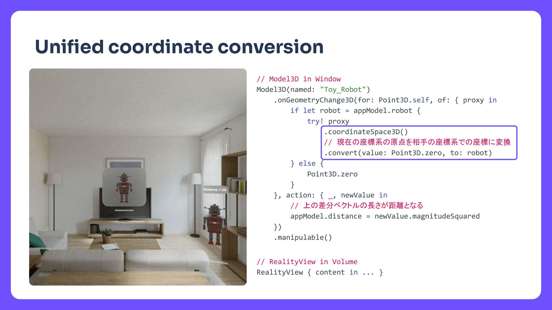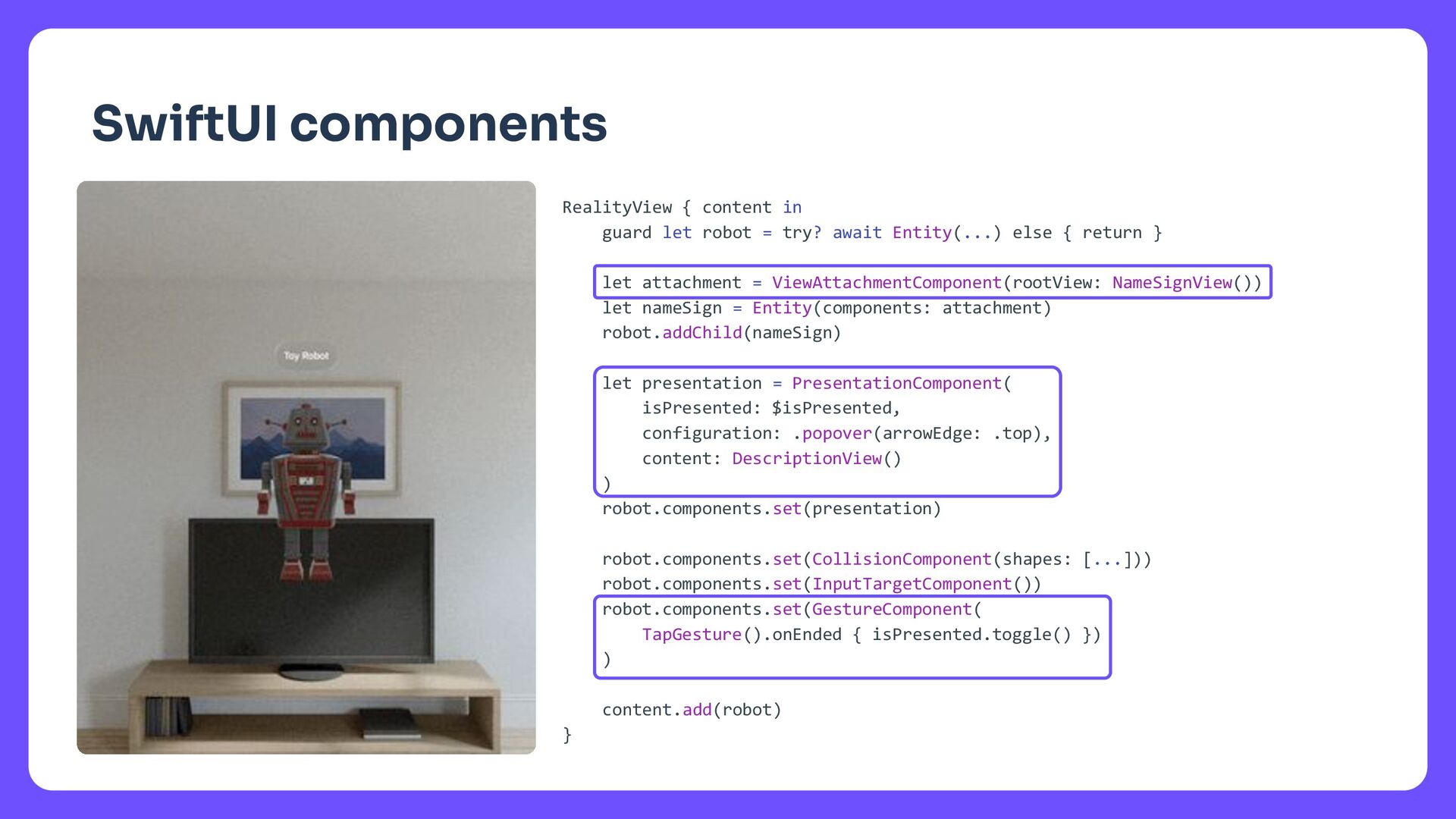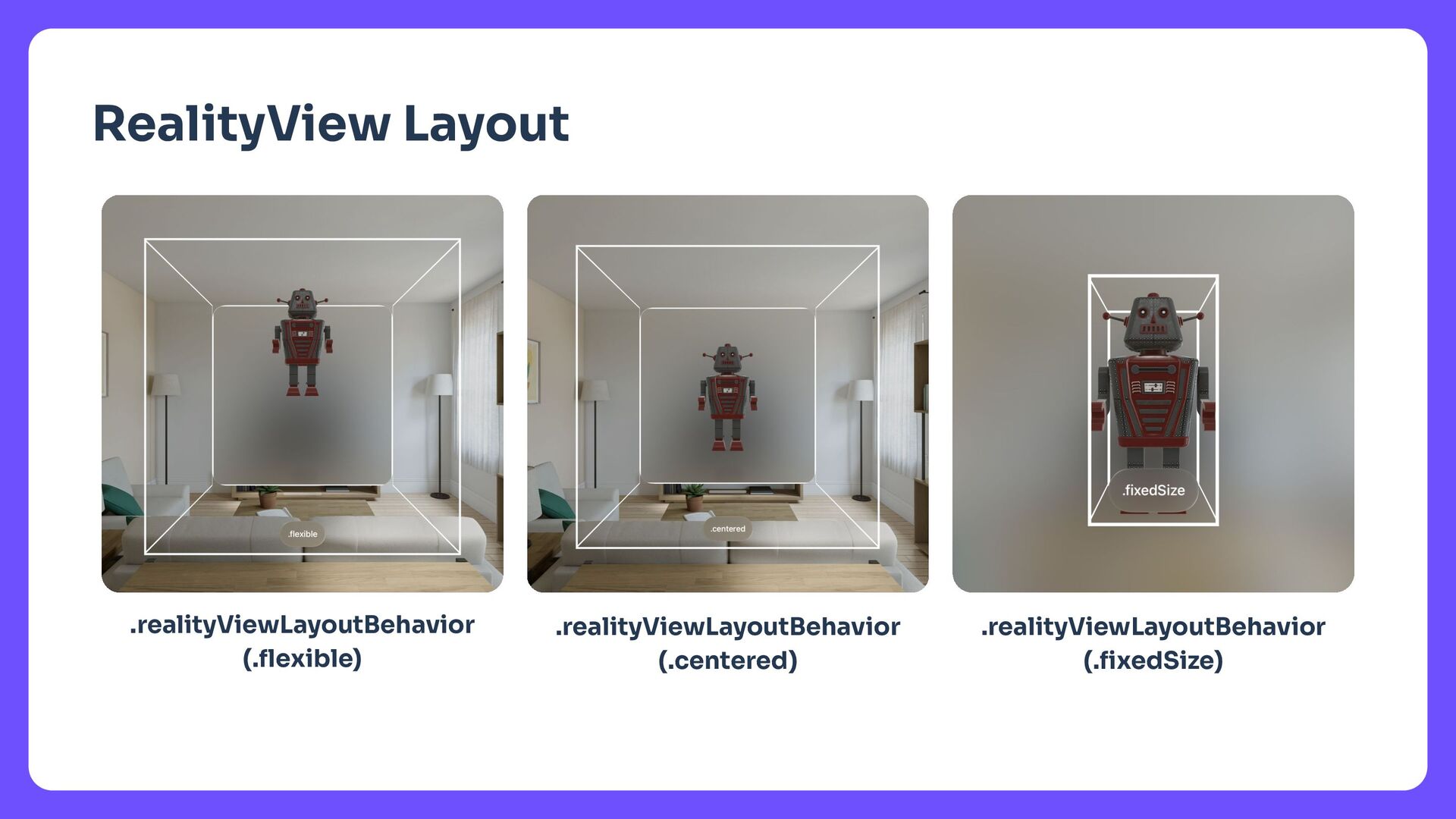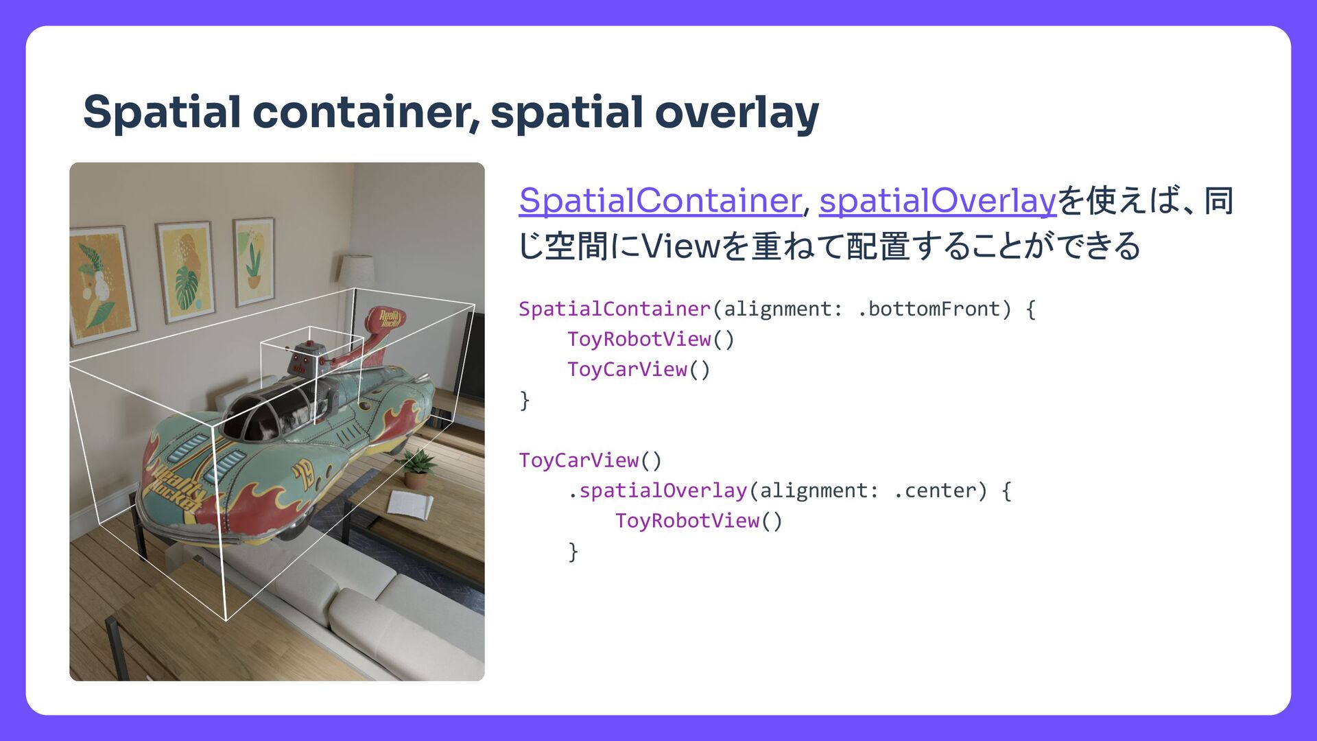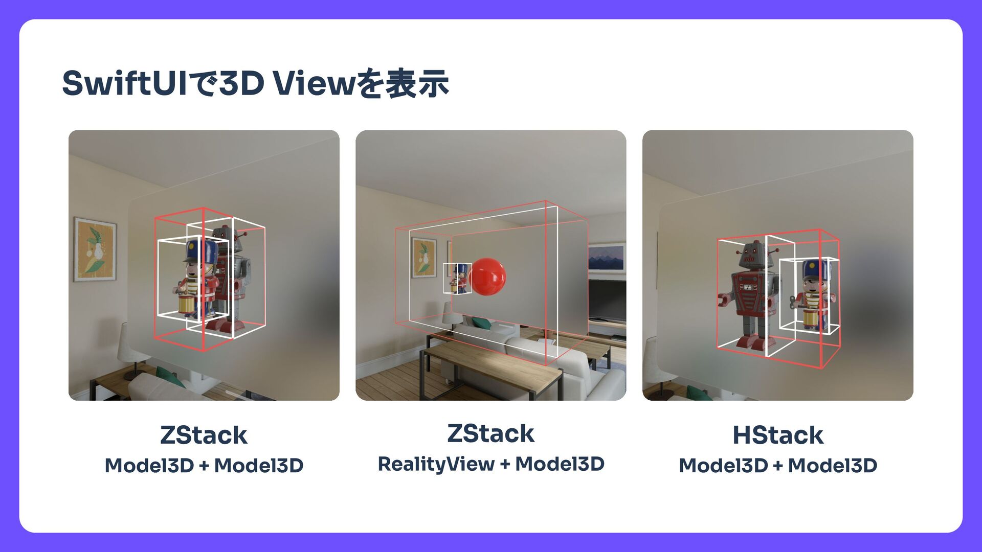 .primaryRotation, .secondaryRotation, .scale, ]) // RealityKit RealityView { content in if let robot = try? await Entity(named: "Toy_Robot", in: realityKitContentBundle) { ManipulationComponent.configureEntity( robot, hoverEffect: .spotlight(.init(color: .red)), allowedInputTypes: .all, collisionShapes: [.generateBox(size: .init(0.5, 0.5, 0.5))] ) content.add(robot) } } .realityViewLayoutBehavior(.centered) ManipulationComponent CollisionComponent InputTargetComponent HoverEffectComponent を自動で追加してくれる