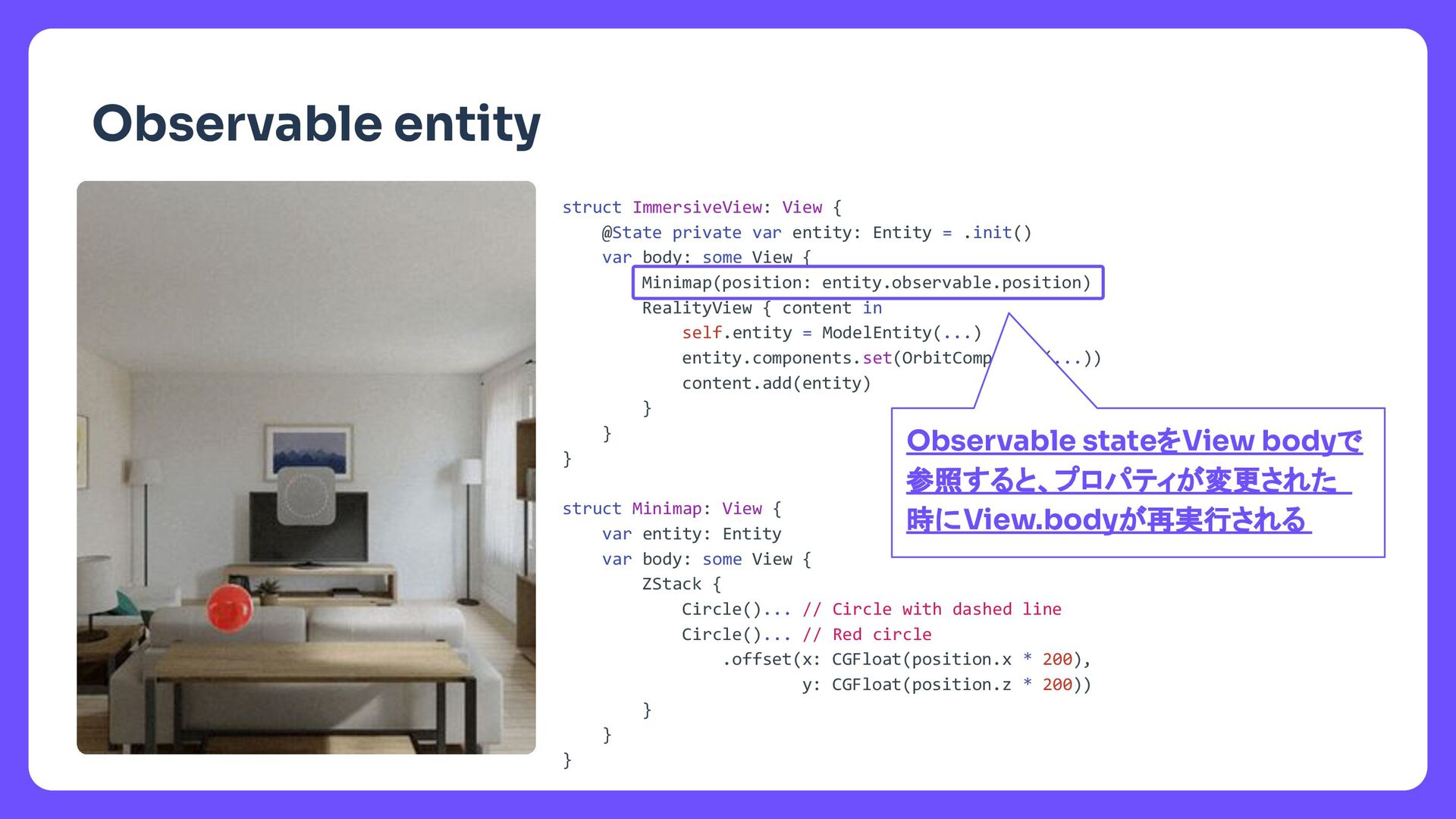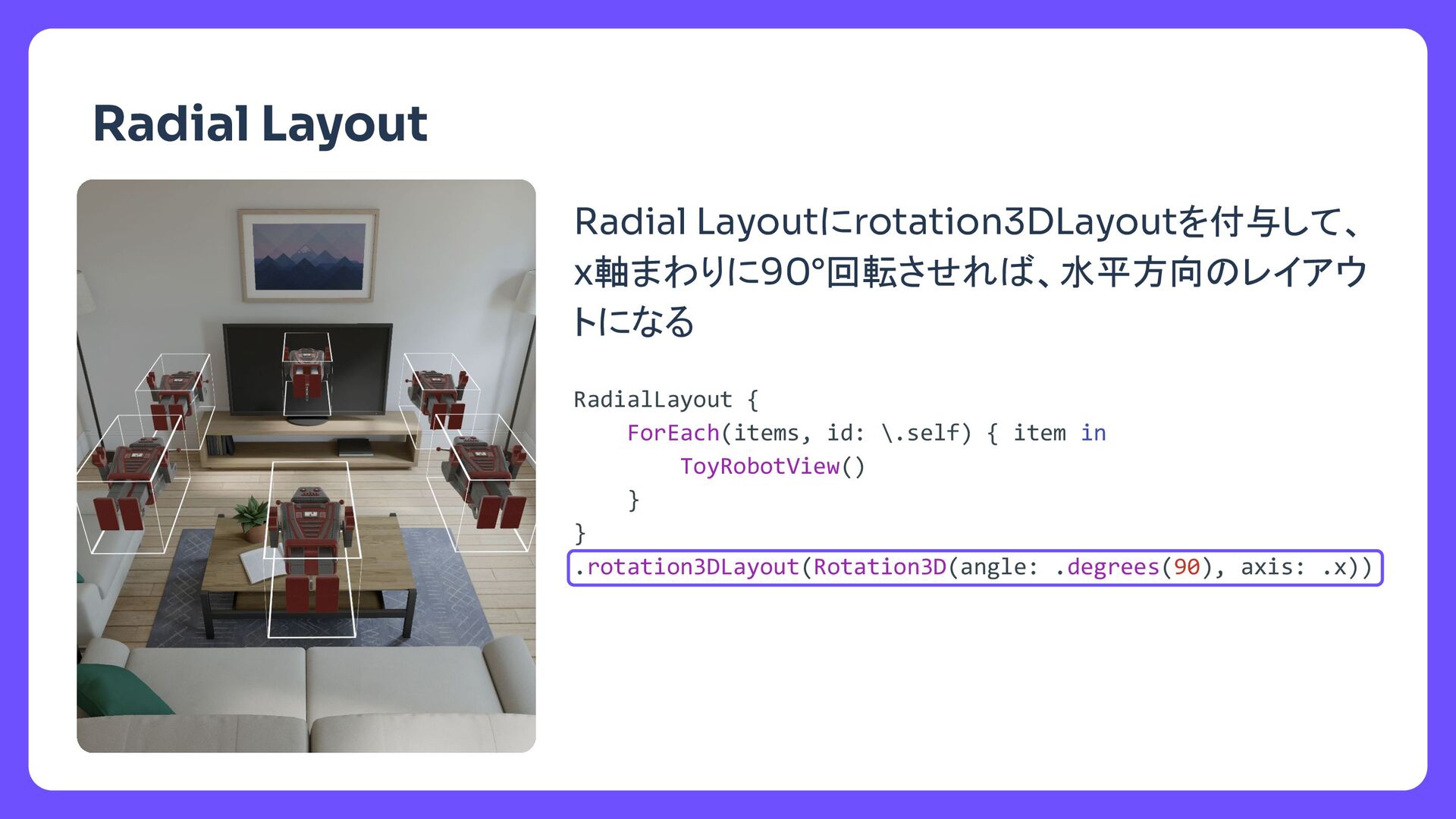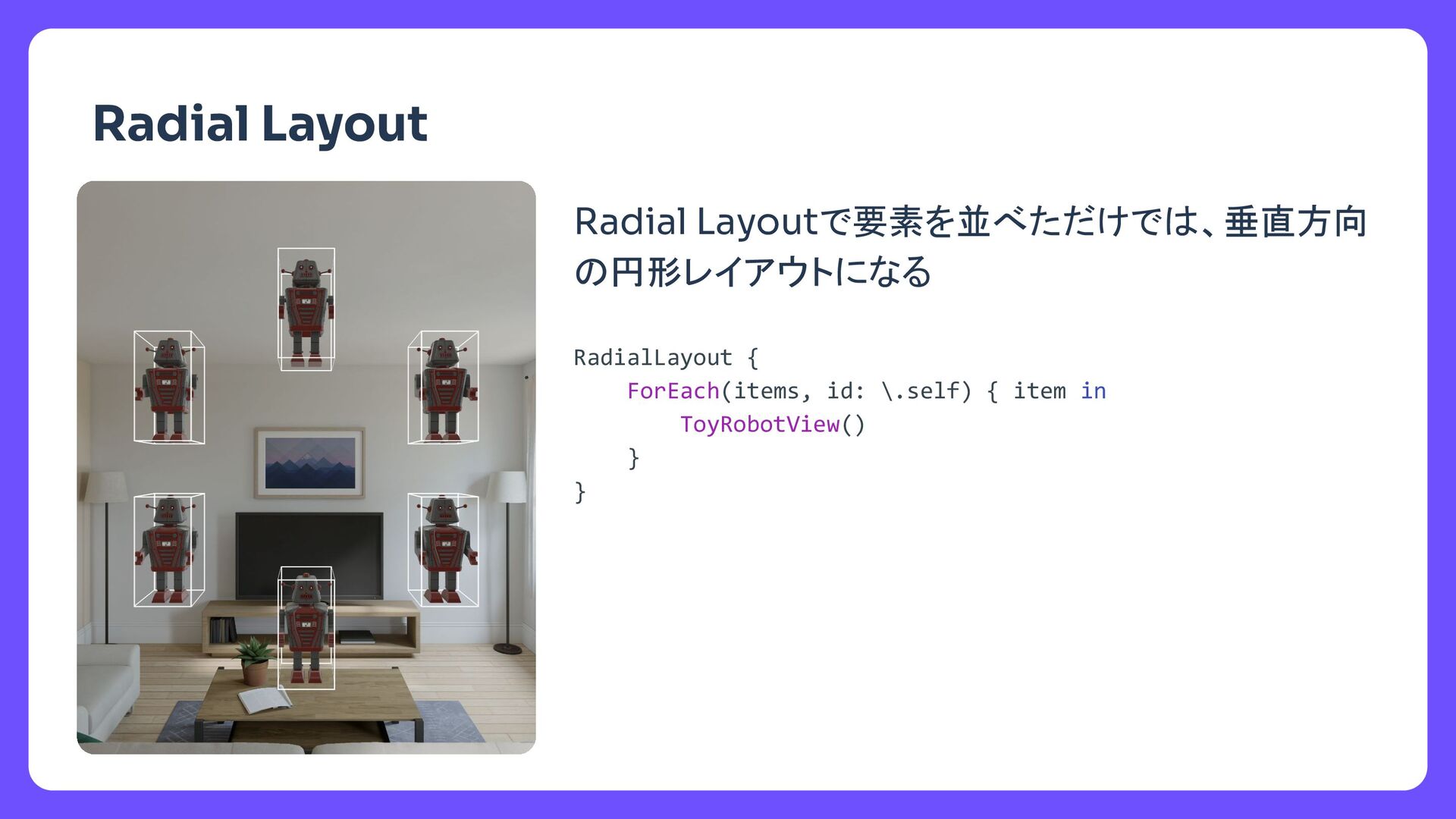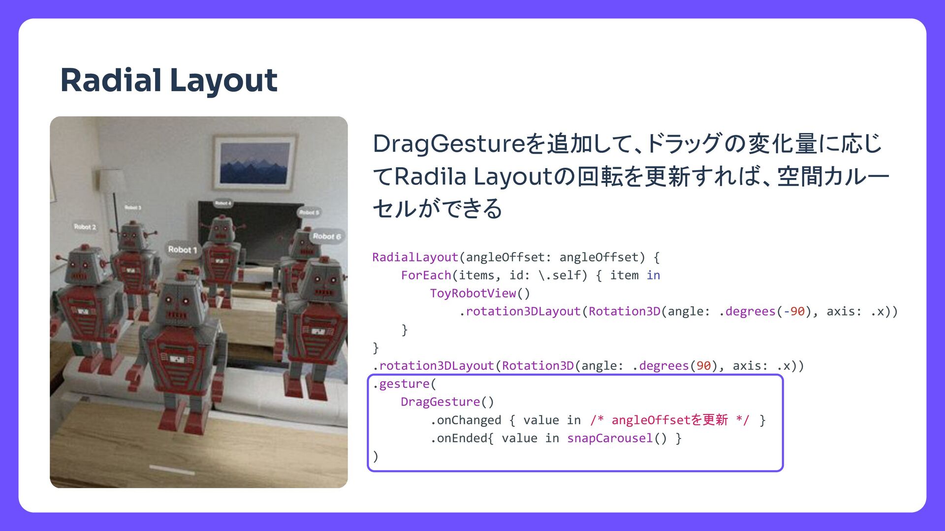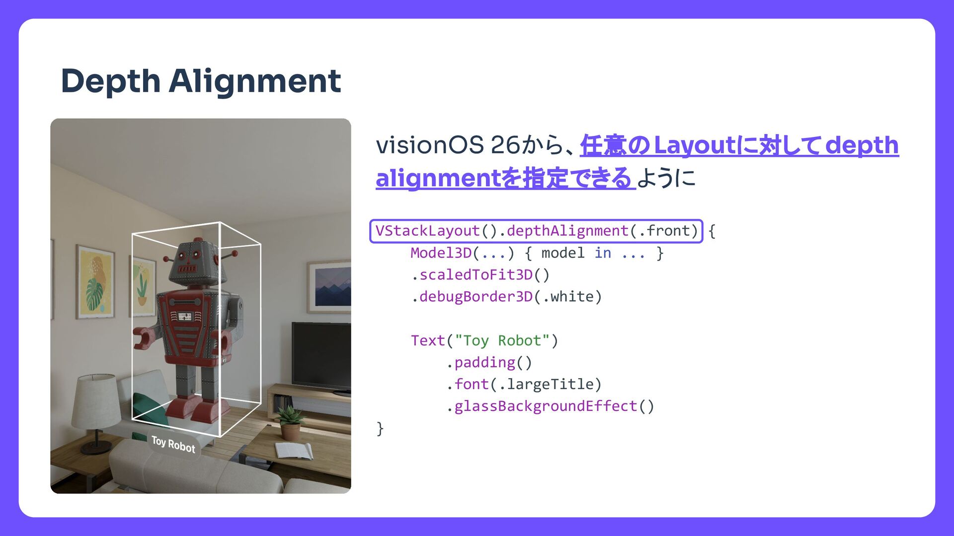 .primaryRotation, .secondaryRotation, .scale, ]) // RealityKit RealityView { content in if let robot = try? await Entity(named: "Toy_Robot", in: realityKitContentBundle) { ManipulationComponent.configureEntity( robot, hoverEffect: .spotlight(.init(color: .red)), allowedInputTypes: .all, collisionShapes: [.generateBox(size: .init(0.5, 0.5, 0.5))] ) content.add(robot) } } .realityViewLayoutBehavior(.centered) ManipulationComponent CollisionComponent InputTargetComponent HoverEffectComponent を自動で追加してくれる