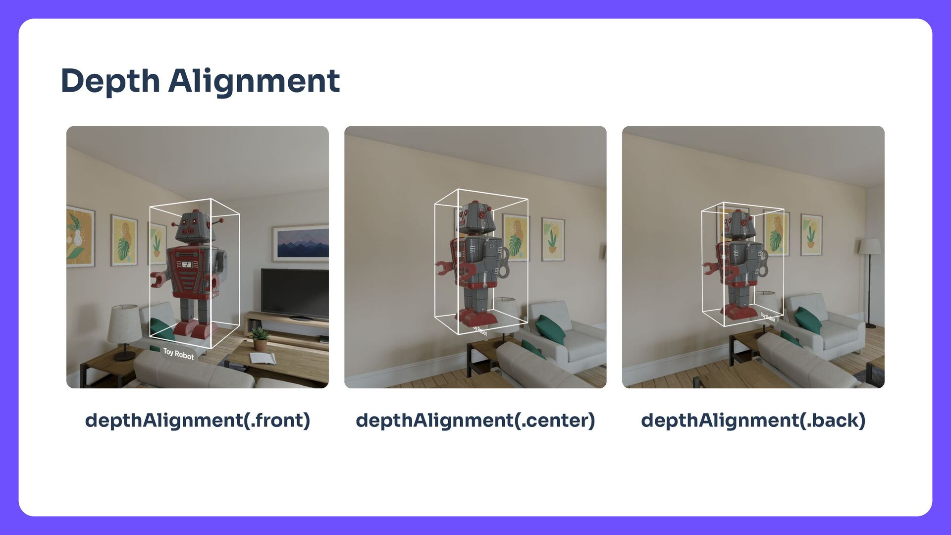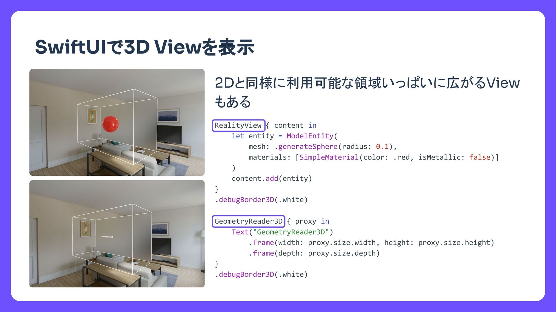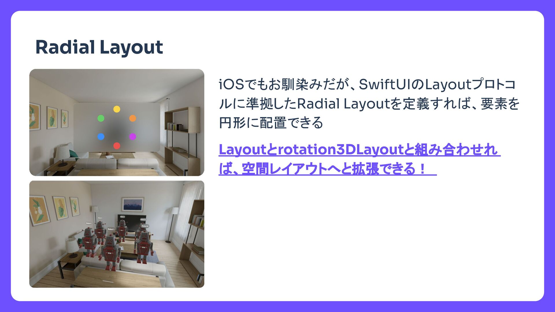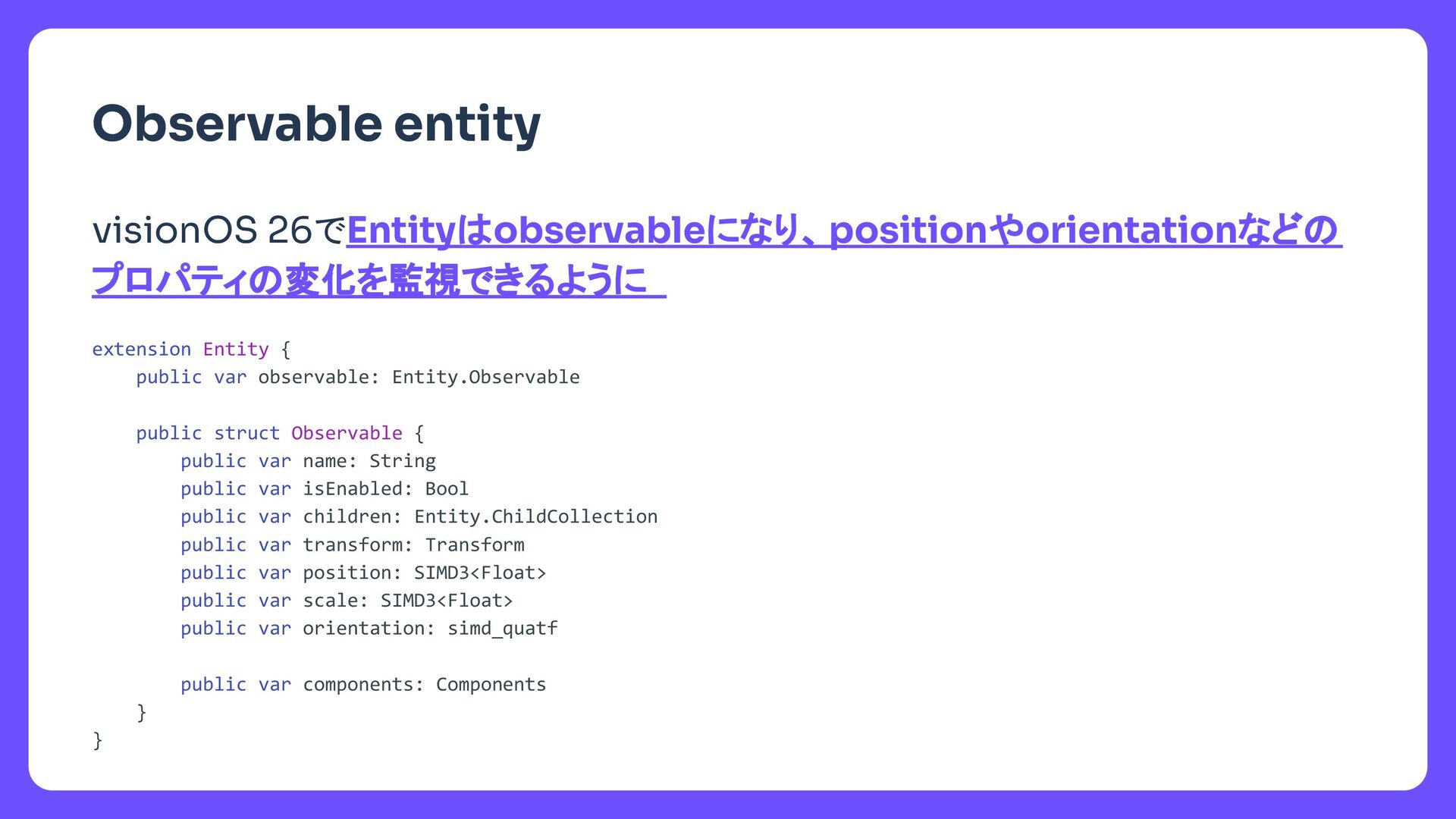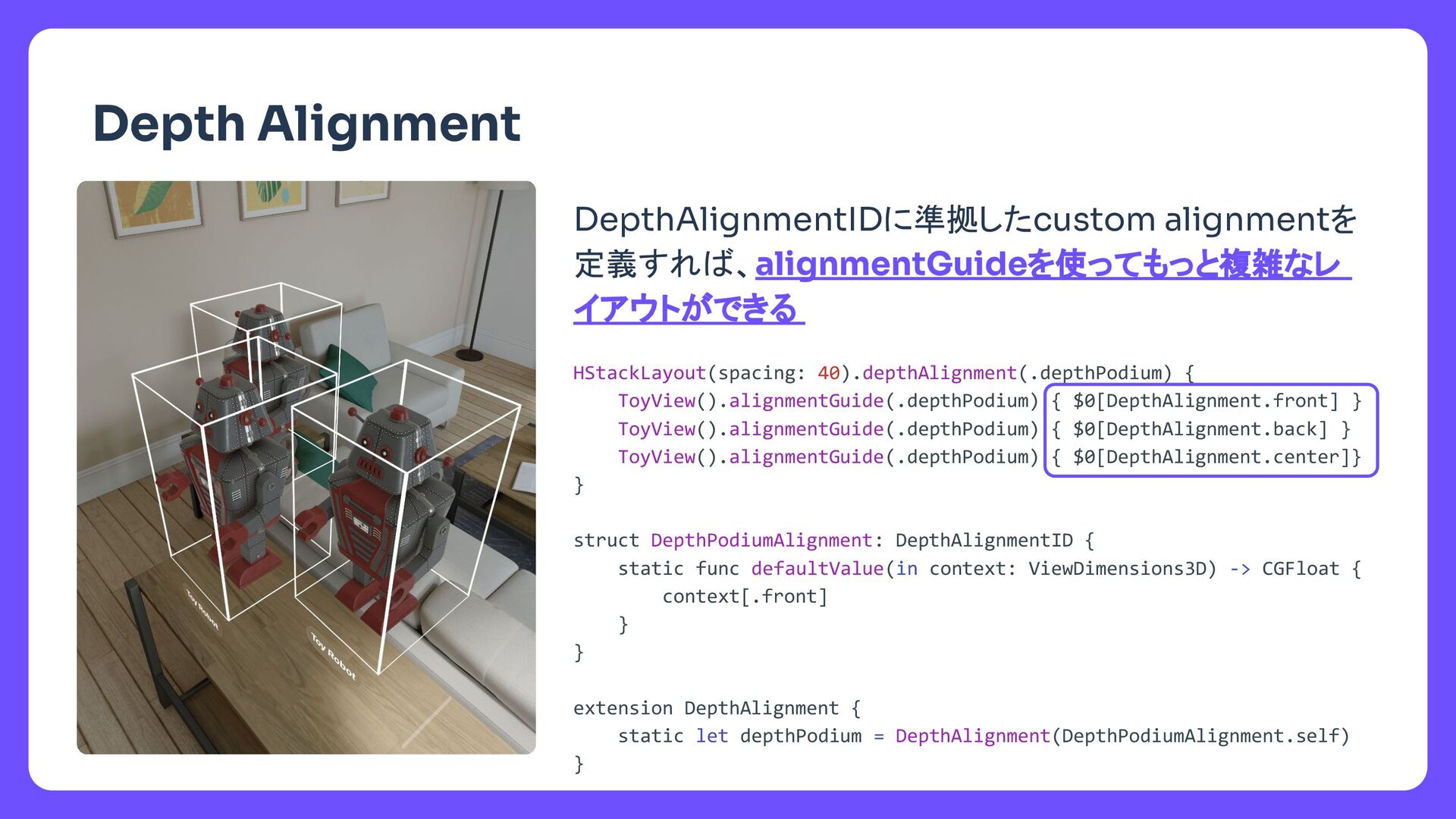 .primaryRotation, .secondaryRotation, .scale, ]) // RealityKit RealityView { content in if let robot = try? await Entity(named: "Toy_Robot", in: realityKitContentBundle) { ManipulationComponent.configureEntity( robot, hoverEffect: .spotlight(.init(color: .red)), allowedInputTypes: .all, collisionShapes: [.generateBox(size: .init(0.5, 0.5, 0.5))] ) content.add(robot) } } .realityViewLayoutBehavior(.centered) ManipulationComponent CollisionComponent InputTargetComponent HoverEffectComponent を自動で追加してくれる