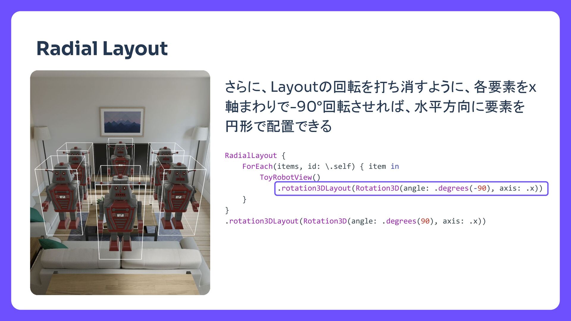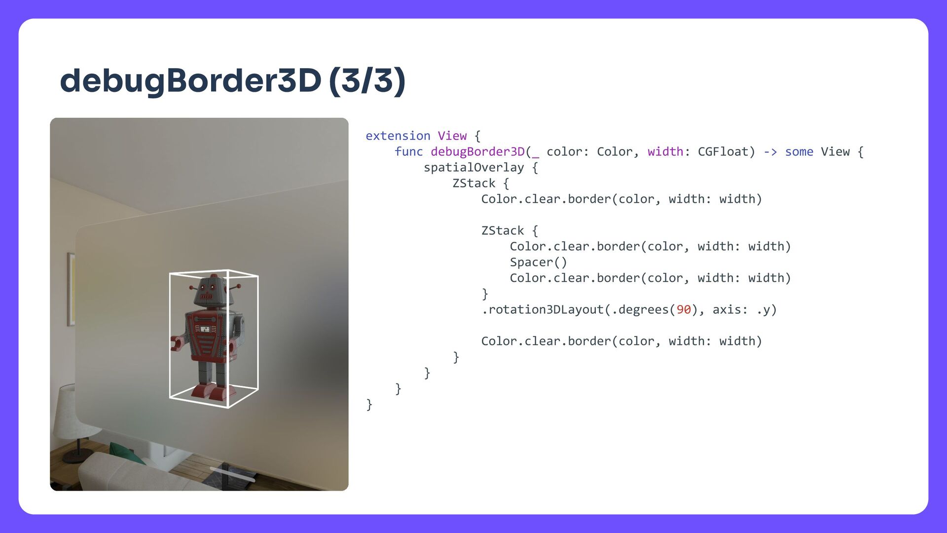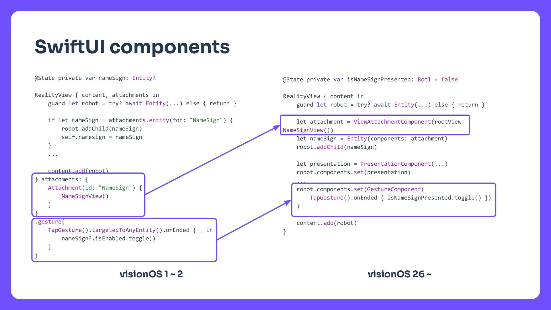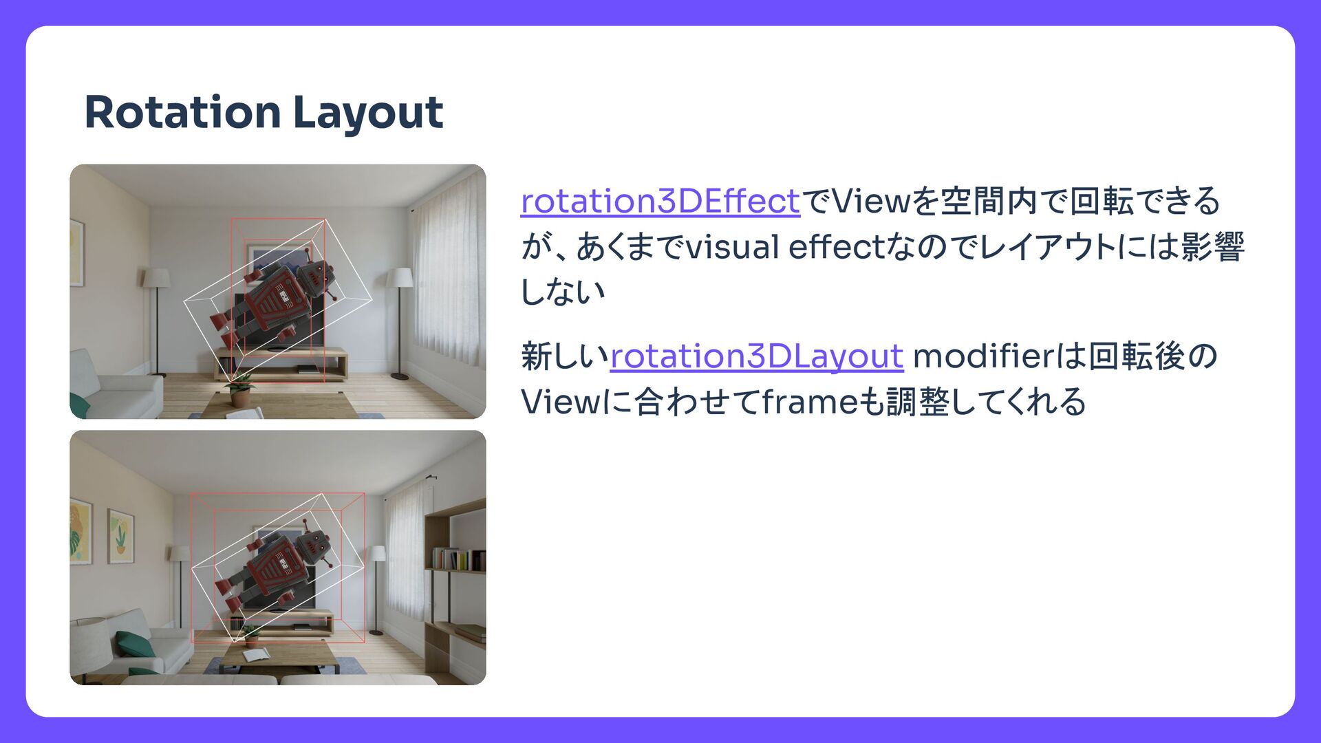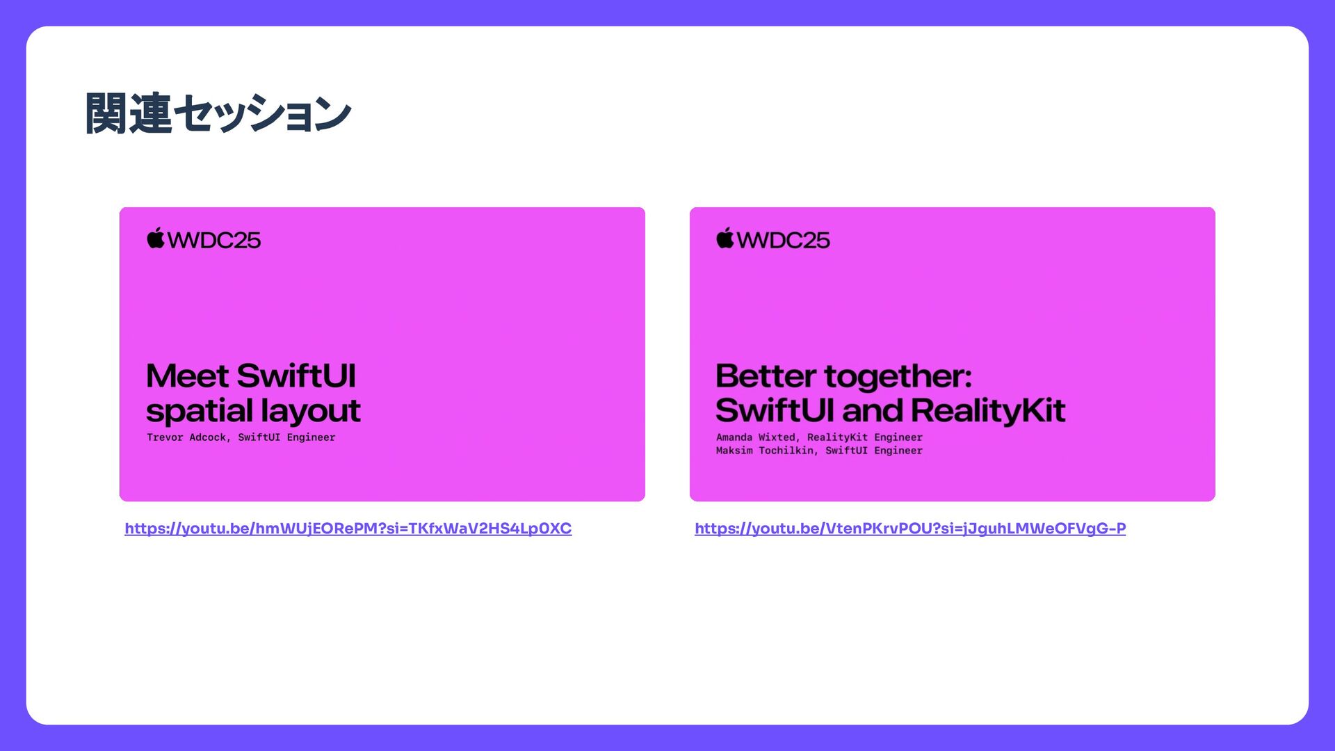 .primaryRotation, .secondaryRotation, .scale, ]) // RealityKit RealityView { content in if let robot = try? await Entity(named: "Toy_Robot", in: realityKitContentBundle) { ManipulationComponent.configureEntity( robot, hoverEffect: .spotlight(.init(color: .red)), allowedInputTypes: .all, collisionShapes: [.generateBox(size: .init(0.5, 0.5, 0.5))] ) content.add(robot) } } .realityViewLayoutBehavior(.centered) ManipulationComponent CollisionComponent InputTargetComponent HoverEffectComponent を自動で追加してくれる