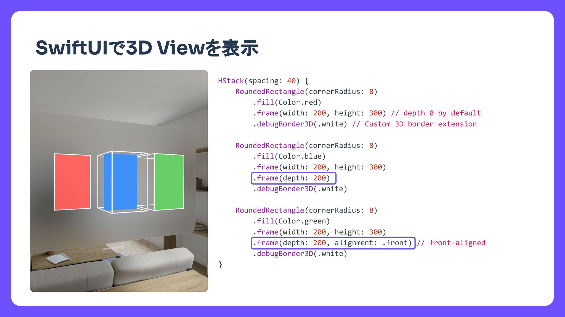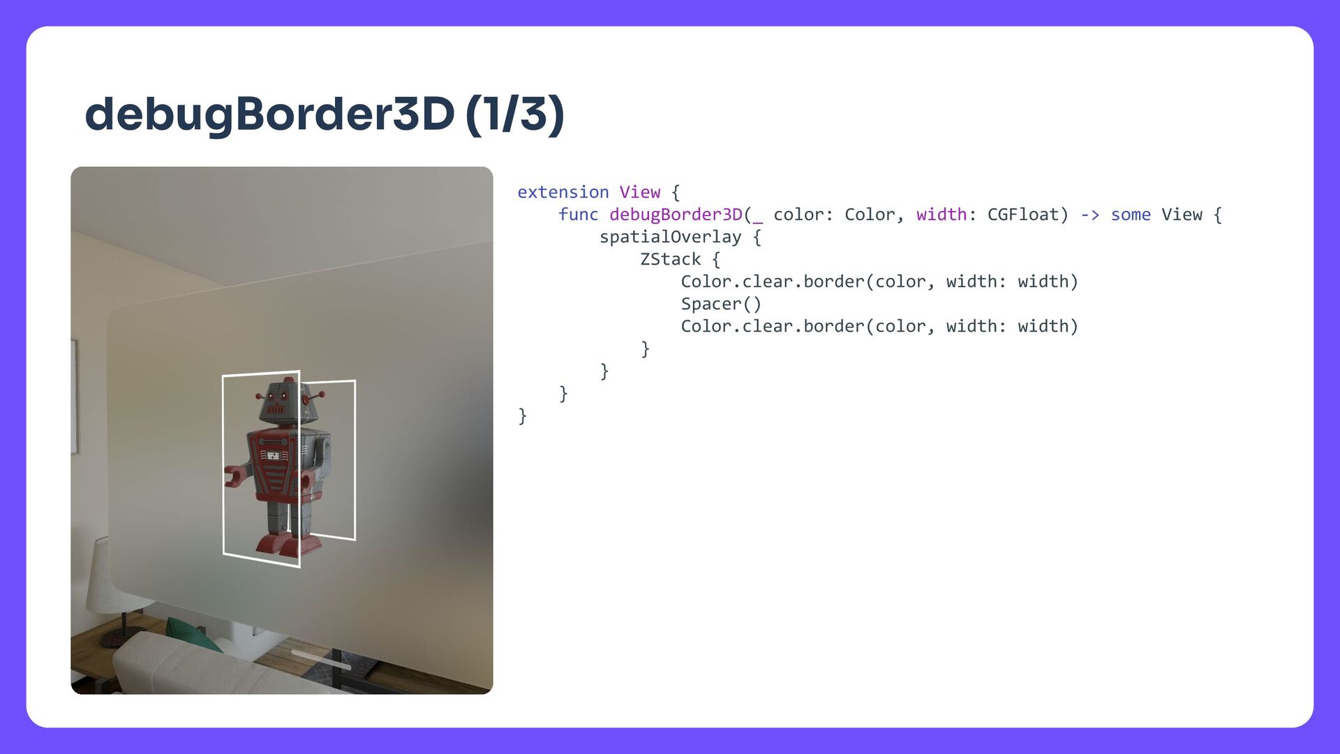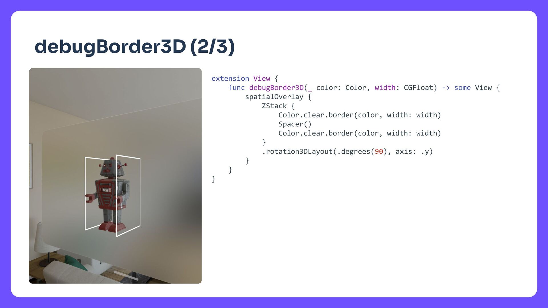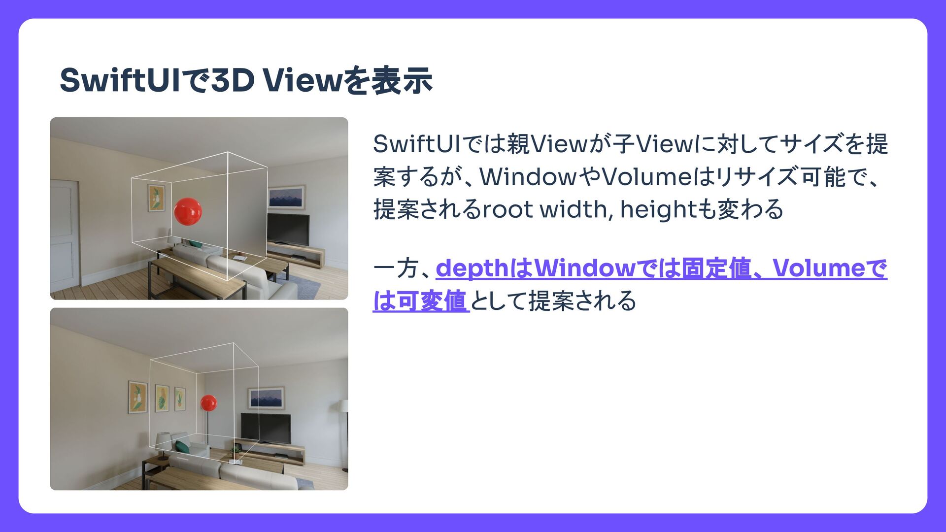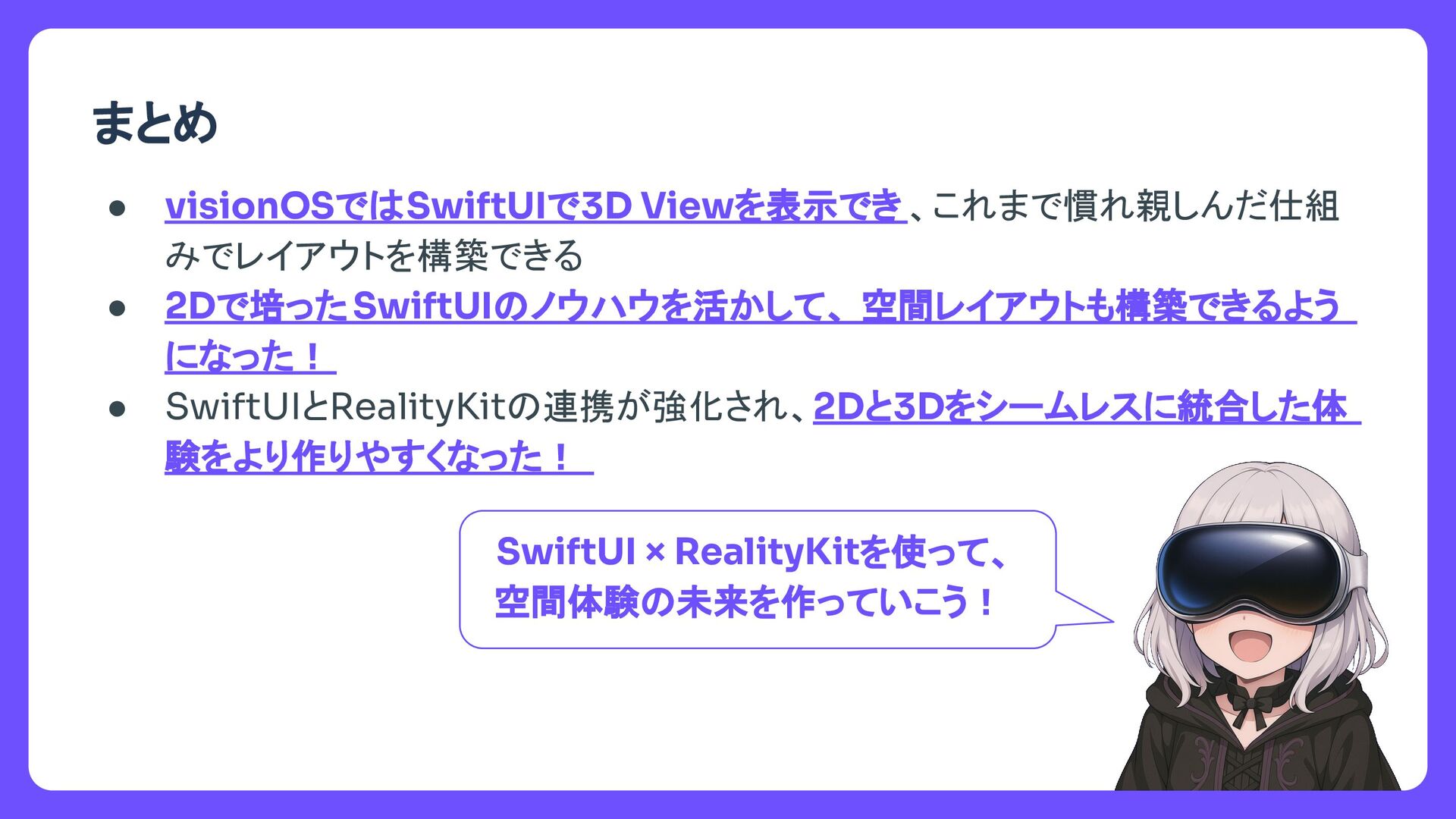 .primaryRotation, .secondaryRotation, .scale, ]) // RealityKit RealityView { content in if let robot = try? await Entity(named: "Toy_Robot", in: realityKitContentBundle) { ManipulationComponent.configureEntity( robot, hoverEffect: .spotlight(.init(color: .red)), allowedInputTypes: .all, collisionShapes: [.generateBox(size: .init(0.5, 0.5, 0.5))] ) content.add(robot) } } .realityViewLayoutBehavior(.centered) ManipulationComponent CollisionComponent InputTargetComponent HoverEffectComponent を自動で追加してくれる