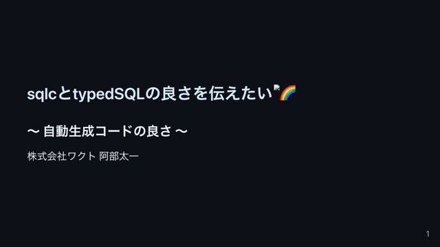 how it works: 1. You write queries in SQL. 2. You run sqlc to generate code with type-safe interfaces to those queries. 3. You write application code that calls the generated code. Check out an interactive example to see it in action, and the introductory blog post for the motivation behind sqlc. 簡単にいうと、 sqlcは、型安全なコードを生成します 🎉 そのために、プログラマーは、 1. SQLを書く 2. sqlcコマンドでコードを生成する 3. アプケーションコードからsqlcで生成されたコードを呼び出す 9