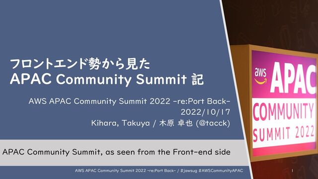 “AI/ML” “DevOps” “Modern Application” “Security” • “フロントエンド” にフォーカスしたセッションは無し。 • 交流では? • 個人課題「英語で話しかけられなかった」 • 韓国のフロントエンドUGの方とは少し話せた。 AWS APAC Community Summit 2022 -re:Port Back- / #jawsug #AWSCommunityAPAC 4 • Is there about Front-end information? • Almost “Community” sessions. On the tech side, no session focuses Front-end. • I couldn't talk enough in English. But, I could speak a little with a Korean-UG member.