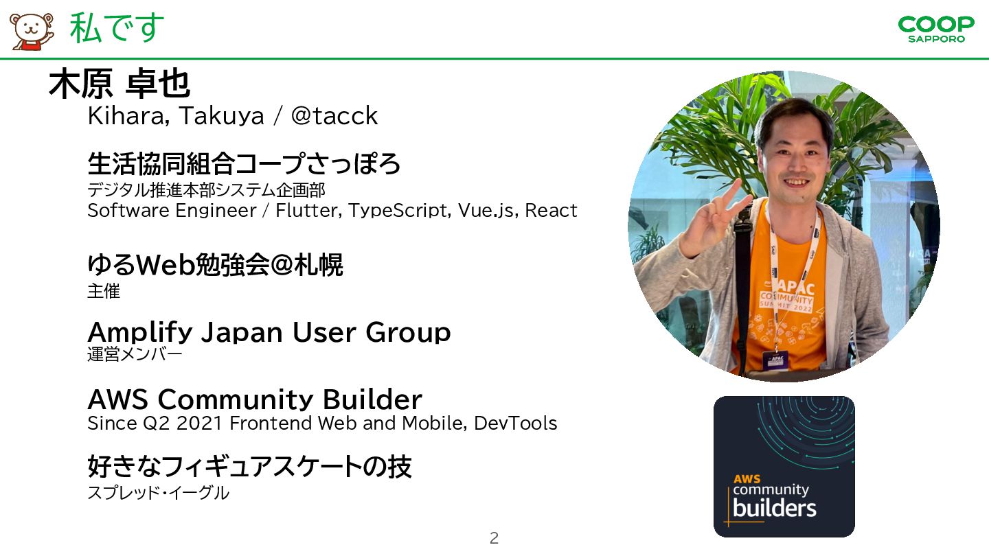 Engineer / Flutter, TypeScript, Vue.js, React ゆるWeb勉強会@札幌 主催 Amplify Japan User Group 運営メンバー AWS Community Builder Since Q2 2021 Frontend Web and Mobile, DevTools 好きなフィギュアスケートの技 スプレッド・イーグル 2