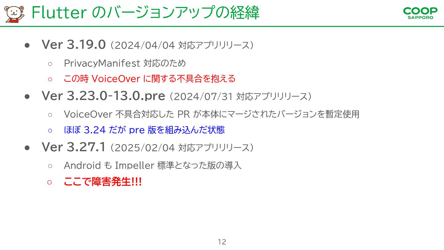 ◦ この時 VoiceOver に関する不具合を抱える • Ver 3.23.0-13.0.pre (2024/07/31 対応アプリリリース) ◦ VoiceOver 不具合対応した PR が本体にマージされたバージョンを暫定使用 ◦ ほぼ 3.24 だが pre 版を組み込んだ状態 • Ver 3.27.1 (2025/02/04 対応アプリリリース) ◦ Android も Impeller 標準となった版の導入 ◦ ここで障害発生!!! 12