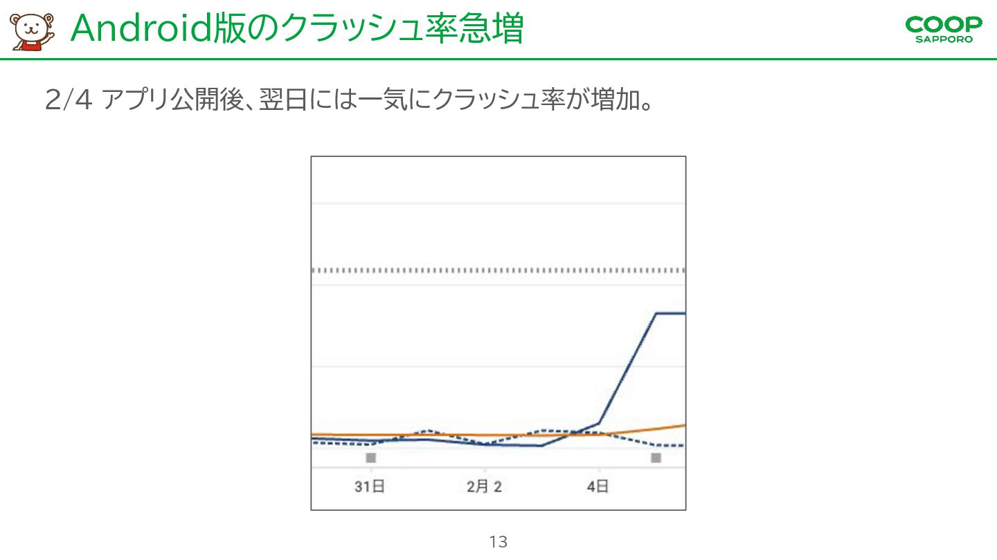Android版のクラッシュ率急増 2/4 アプリ公開後、翌日には一気にクラッシュ率が増加。 13