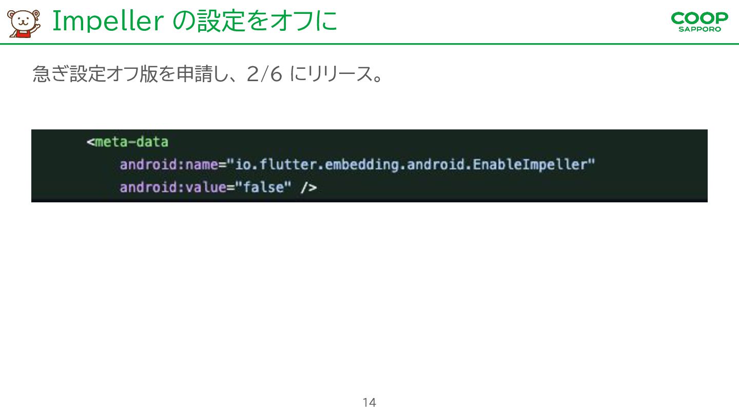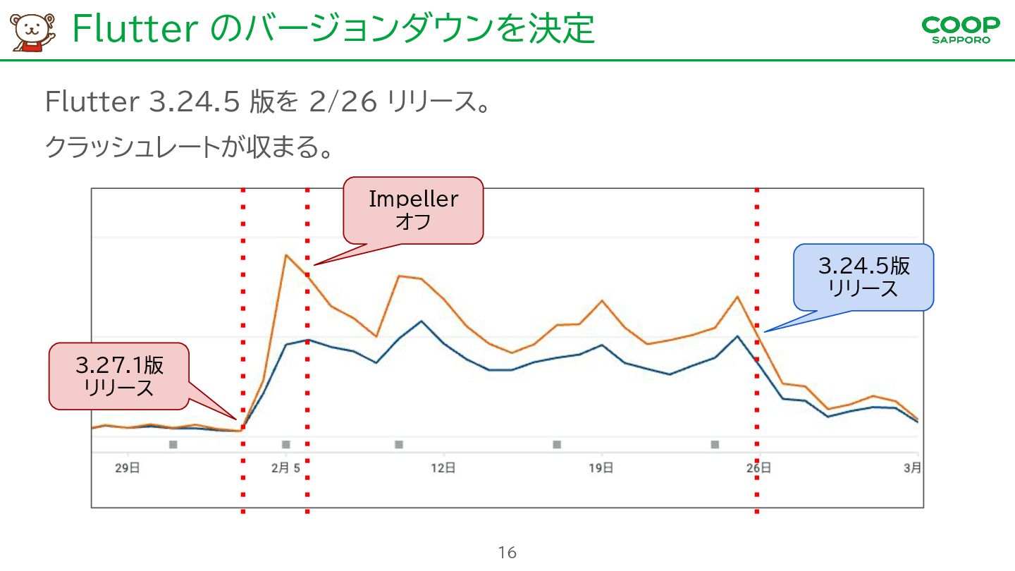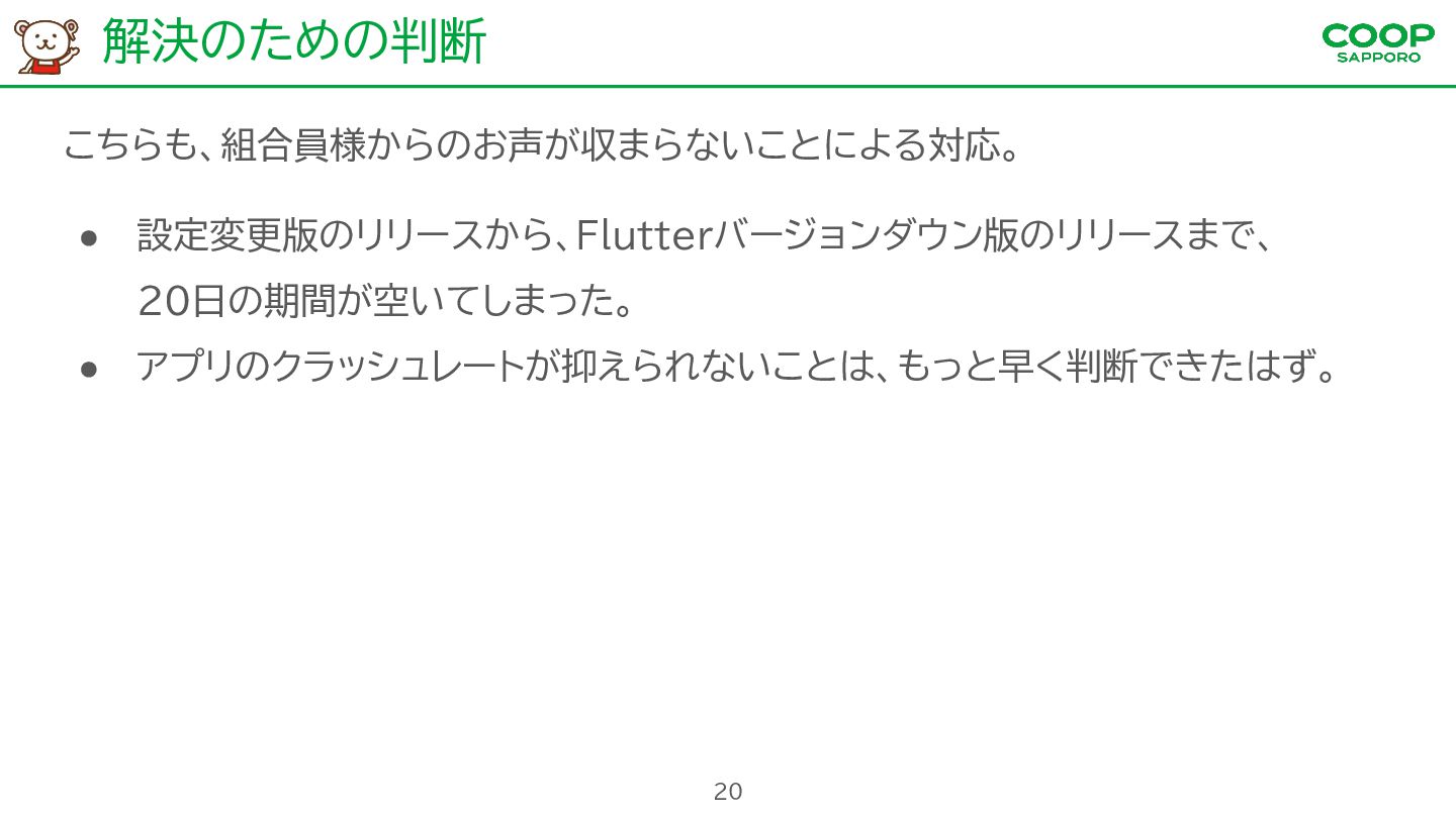 解決のための判断 こちらも、組合員様からのお声が収まらないことによる対応。 • 設定変更版のリリースから、Flutterバージョンダウン版のリリースまで、 20日の期間が空いてしまった。 • アプリのクラッシュレートが抑えられないことは、もっと早く判断できたはず。 20