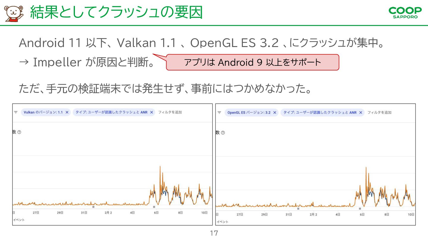 、にクラッシュが集中。 → Impeller が原因と判断。 ただ、手元の検証端末では発生せず、事前にはつかめなかった。 17 アプリは Android 9 以上をサポート