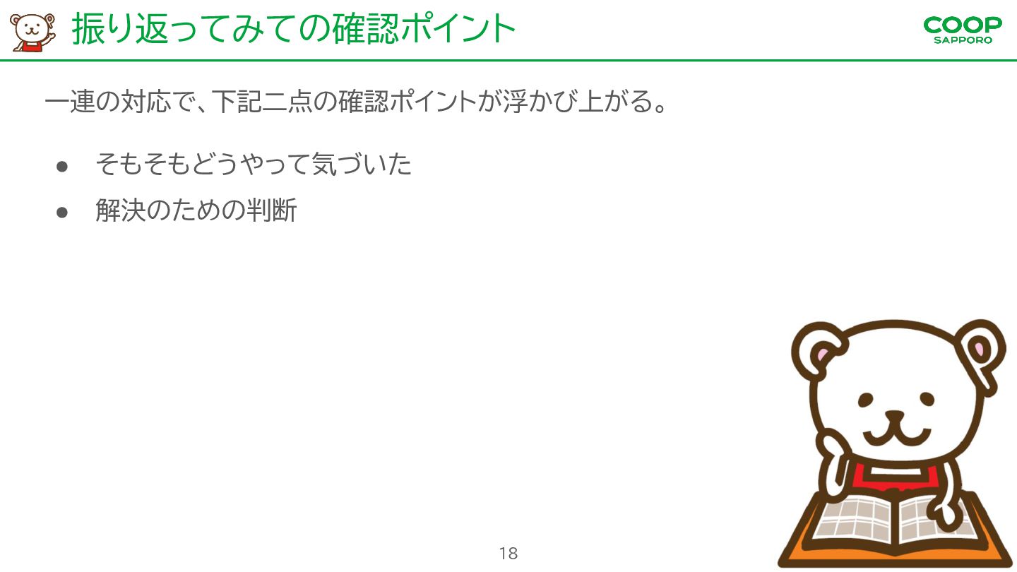 振り返ってみての確認ポイント 一連の対応で、下記二点の確認ポイントが浮かび上がる。 • そもそもどうやって気づいた • 解決のための判断 18