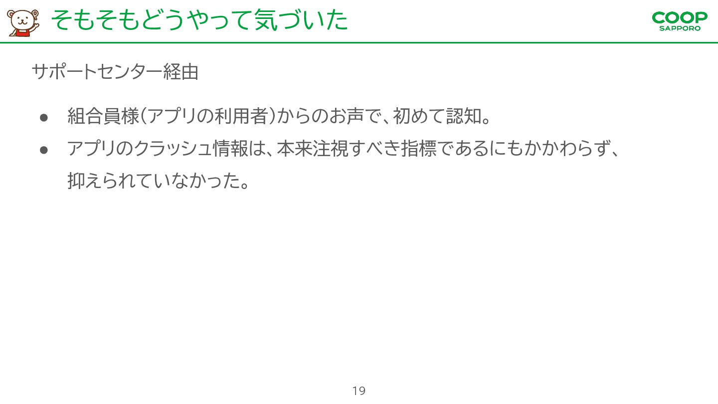 そもそもどうやって気づいた サポートセンター経由 • 組合員様(アプリの利用者)からのお声で、初めて認知。 • アプリのクラッシュ情報は、本来注視すべき指標であるにもかかわらず、 抑えられていなかった。 19