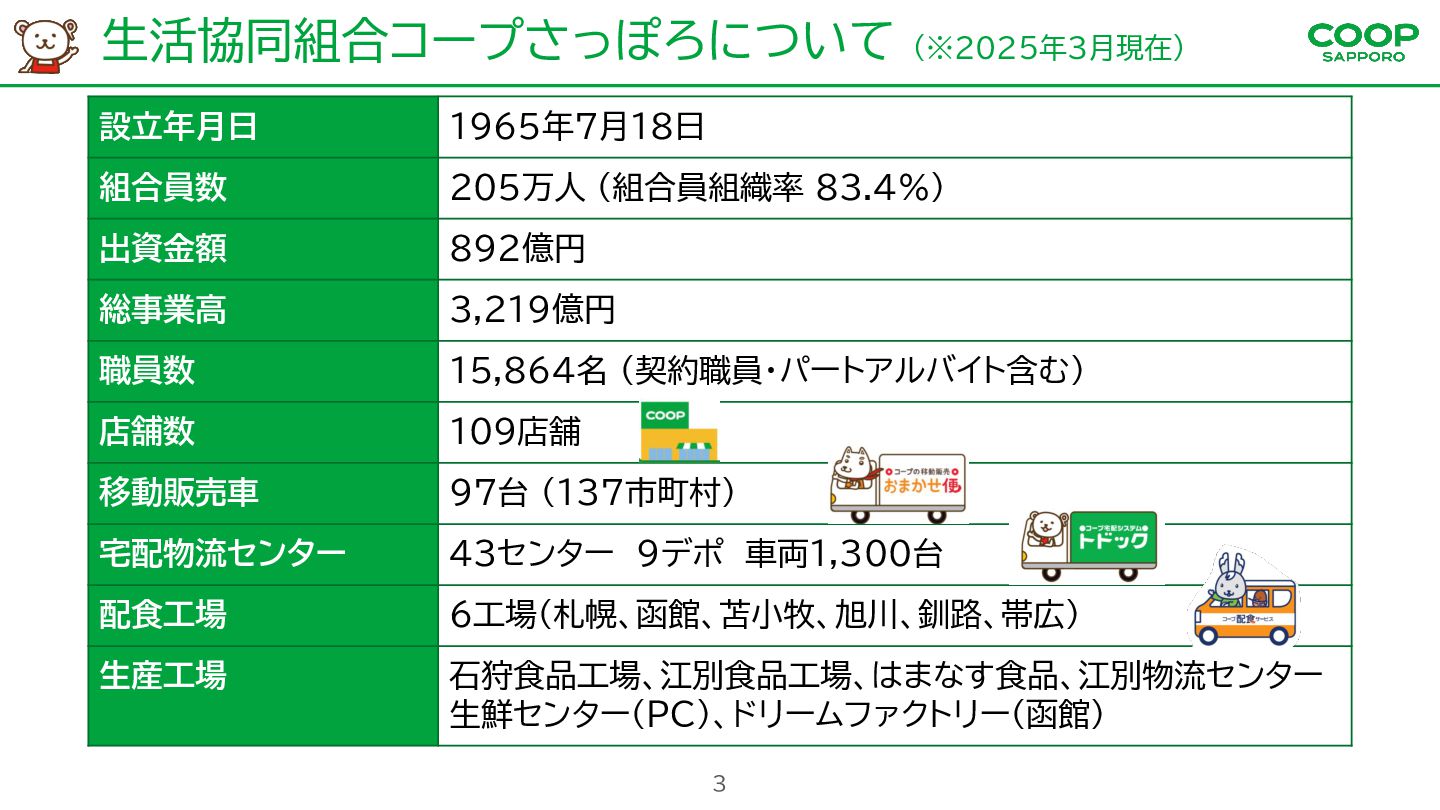 892億円 総事業高 3,219億円 職員数 15,864名 (契約職員・パートアルバイト含む) 店舗数 109店舗 移動販売車 97台 (137市町村) 宅配物流センター 43センター 9デポ 車両1,300台 配食工場 6工場(札幌、函館、苫小牧、旭川、釧路、帯広) 生産工場 石狩食品工場、江別食品工場、はまなす食品、江別物流センター 生鮮センター(PC)、ドリームファクトリー(函館)