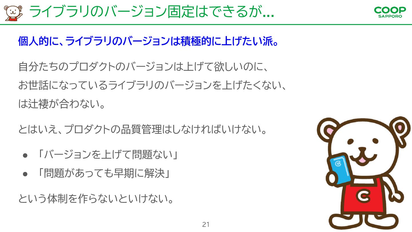 ライブラリのバージョン固定はできるが... 個人的に、ライブラリのバージョンは積極的に上げたい派。 自分たちのプロダクトのバージョンは上げて欲しいのに、 お世話になっているライブラリのバージョンを上げたくない、 は辻褄が合わない。 とはいえ、プロダクトの品質管理はしなければいけない。 • 「バージョンを上げて問題ない」 • 「問題があっても早期に解決」