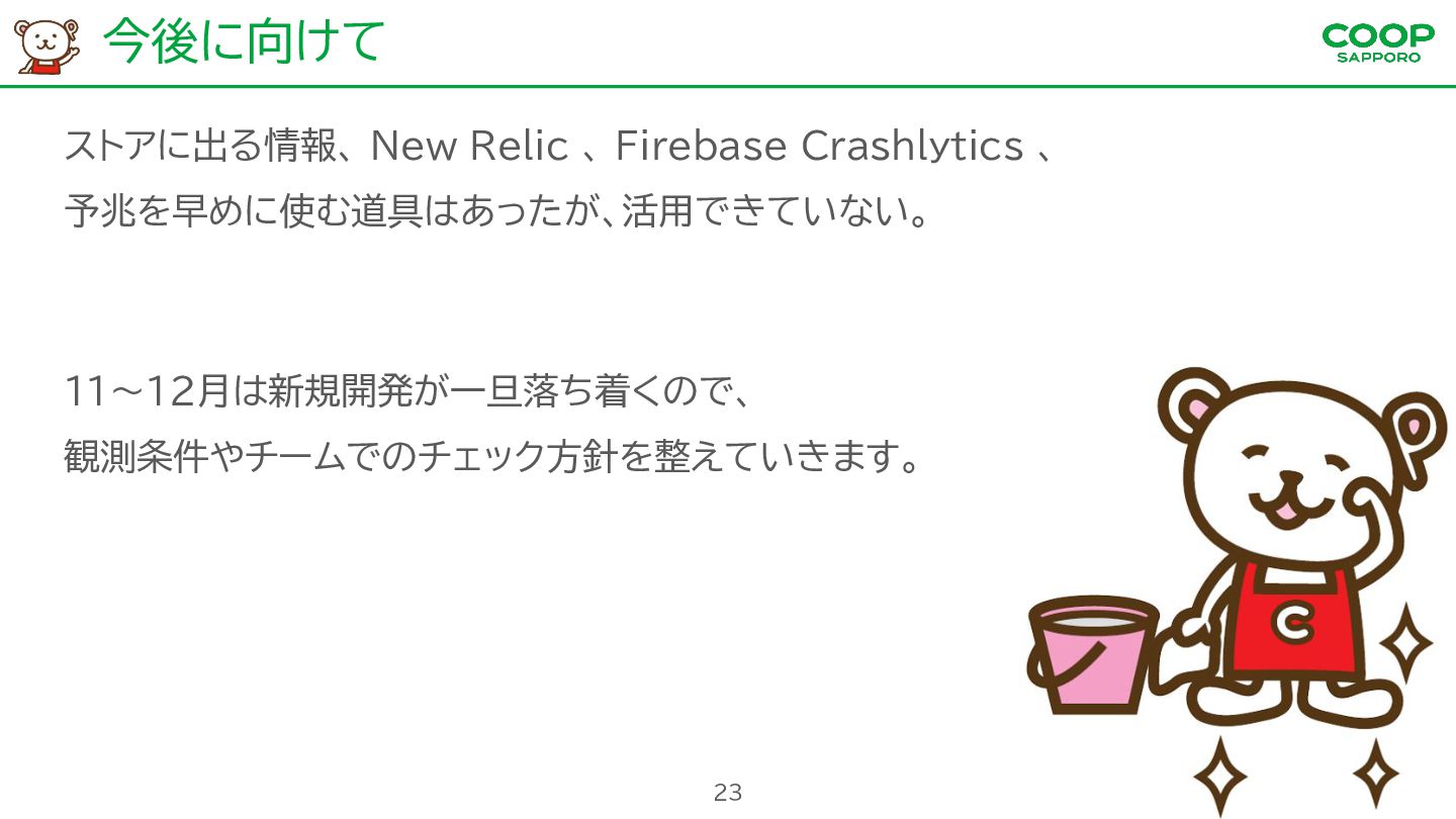 今後に向けて ストアに出る情報、 New Relic 、 Firebase Crashlytics 、 予兆を早めに使む道具はあったが、活用できていない。 11〜12月は新規開発が一旦落ち着くので、