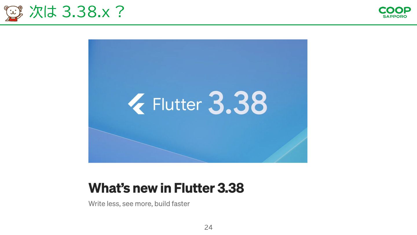 Flutter のバージョンアップの経緯 • Ver 3.19.0 (2024/04/04 対応アプリリリース) ◦ PrivacyManifest 対応のため
