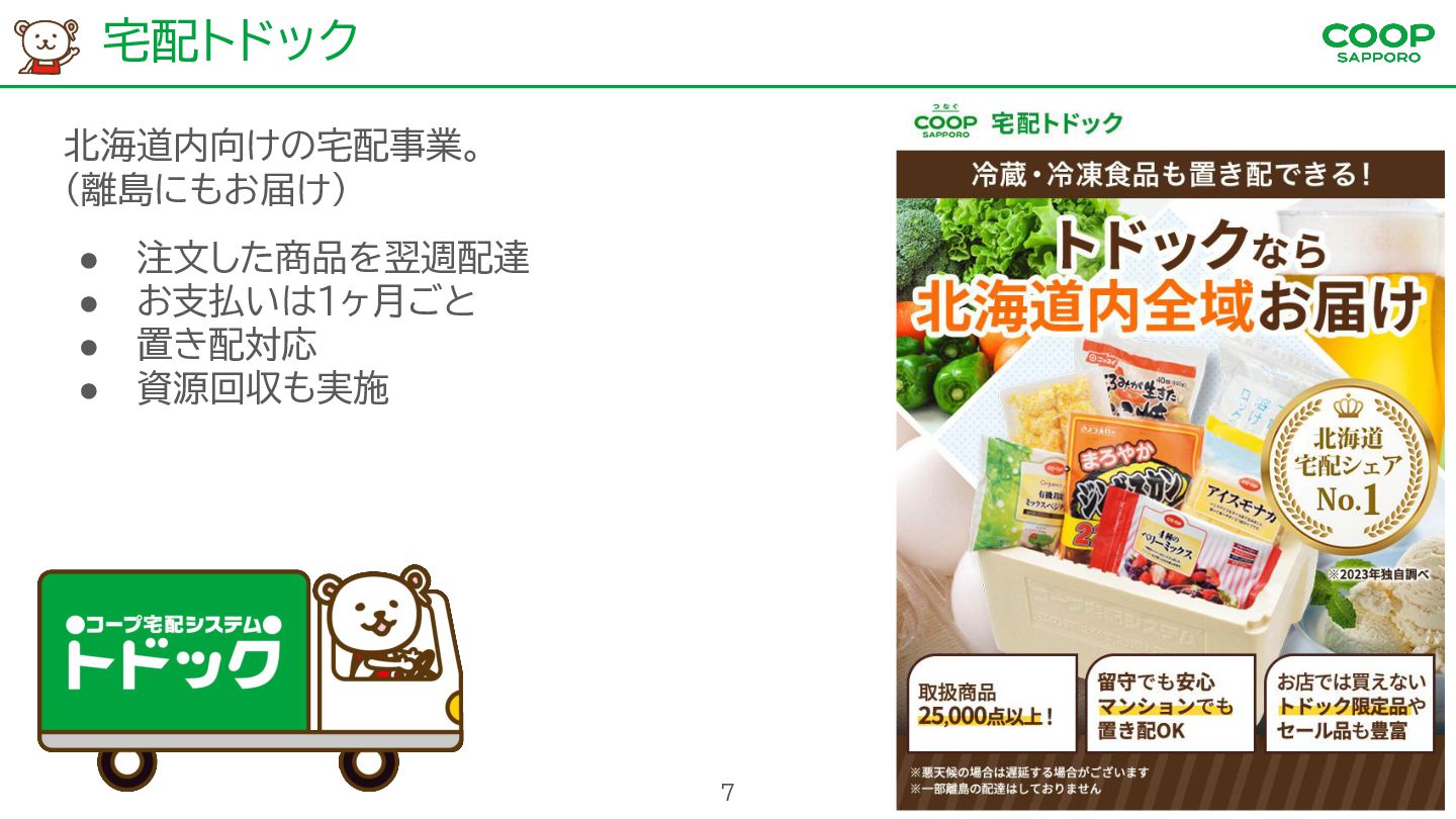 宅配トドック 北海道内向けの宅配事業。 (離島にもお届け) • 注文した商品を翌週配達 • お支払いは1ヶ月ごと • 置き配対応 •