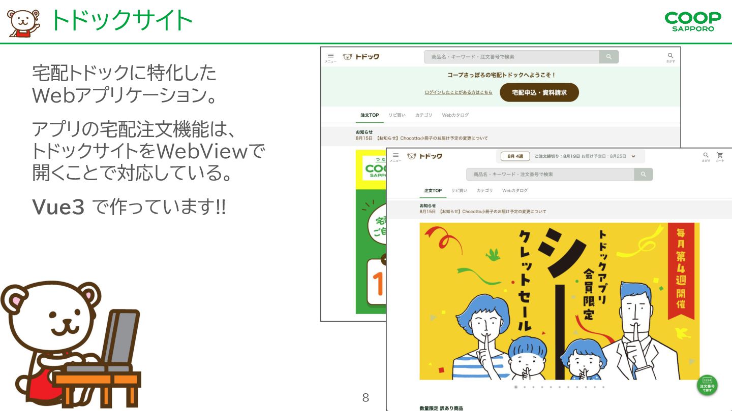 トドックサイト 宅配トドックに特化した Webアプリケーション。 アプリの宅配注文機能は、 トドックサイトをWebViewで 開くことで対応している。 Vue3 で作っています!! 8