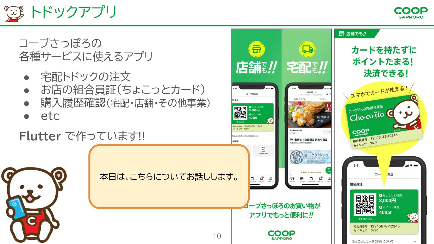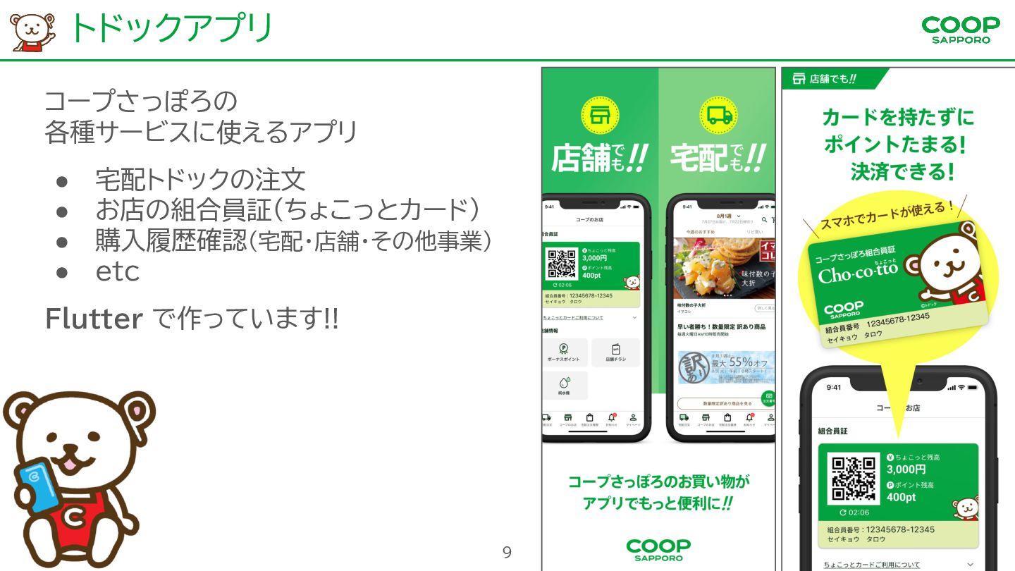 トドックアプリ コープさっぽろの 各種サービスに使えるアプリ • 宅配トドックの注文 • お店の組合員証(ちょこっとカード) • 購入履歴確認(宅配・店舗・その他事業) •