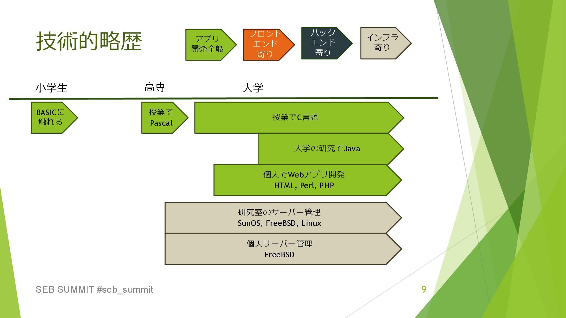 C++ 個人サーバー管理 FreeBSD 社会人 個人でWebアプリ開発 HTML, PHP PCアプリ C++, C# 個人でクラウド管理 Sakura, Heroku, Google Cloud, AWS 個人でWebアプリ開発 JavaScript, TypeScript Firebase, AWS Amplify スマホ アプリ Flutter Web アプリ TypeScript Web API Go データ 処理 C++ Webアプリ HTML, JavaScript, PHP, Java アプリ 開発全般 フロント エンド 寄り バック エンド 寄り インフラ 寄り サービス用インフラ構築管理 IaC, CI/CD, Google Cloud, AWS スマホゲーム JavaScript, Java, Swift Web アプリ HTML, Java