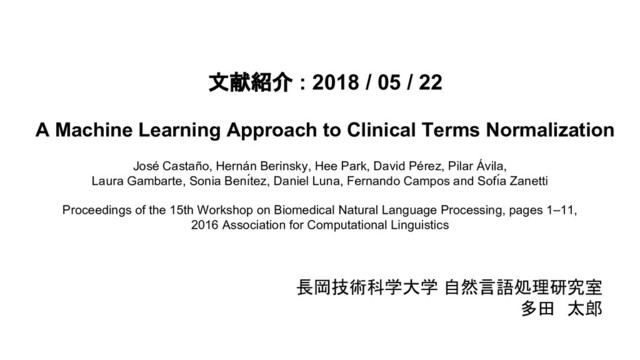 Approach to Clinical Terms Normalization José Castaño, Hernán Berinsky, Hee Park, David Pérez, Pilar Ávila, Laura Gambarte, Sonia Benı́tez, Daniel Luna, Fernando Campos and Sofı́a Zanetti Proceedings of the 15th Workshop on Biomedical Natural Language Processing, pages 1–11, 2016 Association for Computational Linguistics 長岡技術科学大学 自然言語処理研究室 多田 太郎