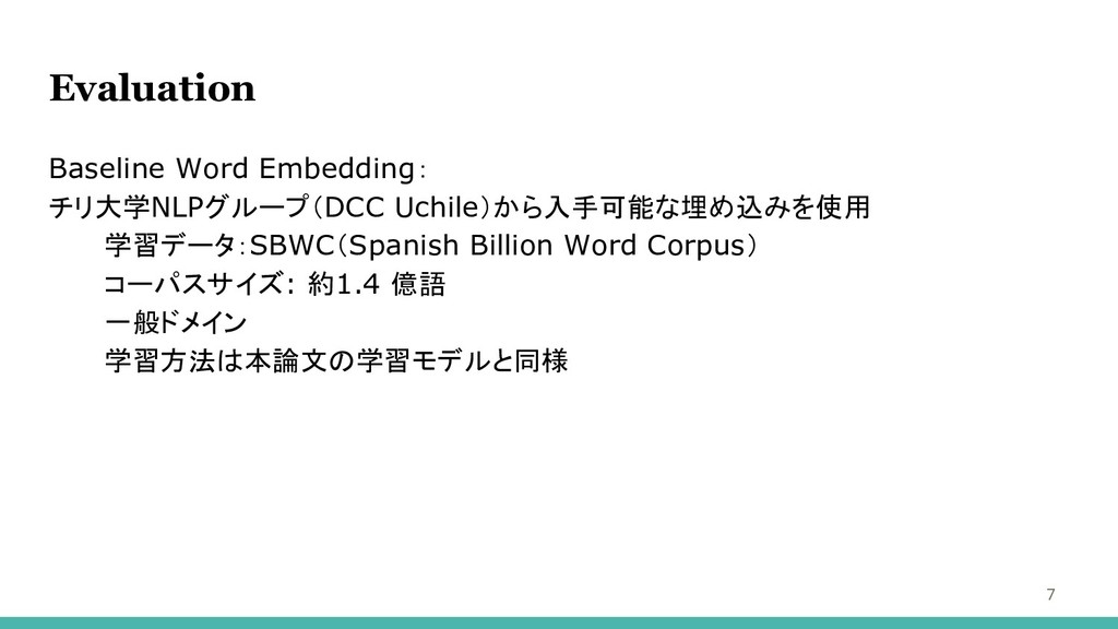 Evaluation 7 Baseline Word Embedding: チリ大学NLPグループ(DCC Uchile)から入手可能な埋め込みを使用 学習データ:SBWC(Spanish Billion Word