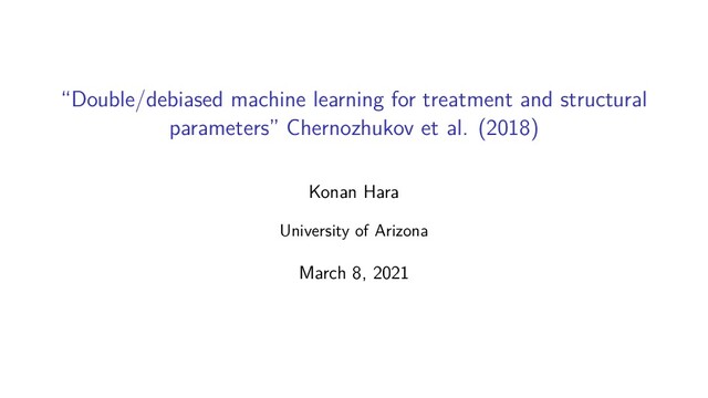 Victor Chernozhukov’s 2016 U Chicago presentation. https://www.youtube.com/watch?v=eHOjmyoPCFU Konan Hara (Arizona) Double/debiased machine learning March 8, 2021 2 / 26