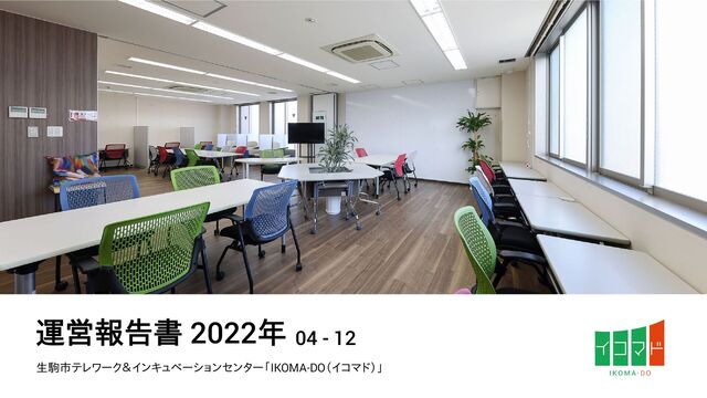 はじめに 2022年4月から「生駒市テレワーク&インキュベー ションセンター IKOMA-DO(イコマド)」の指定管 理者となりました。これまでのテレワーク利用に加 え、インキュベーション(創業・起業)機能の強化を 図りました。リニューアルオープンに向け、利用時間 の拡大・起業/創業にまつわるイベント開催・利用 規約の策定・料金体系の見直しを行いました。