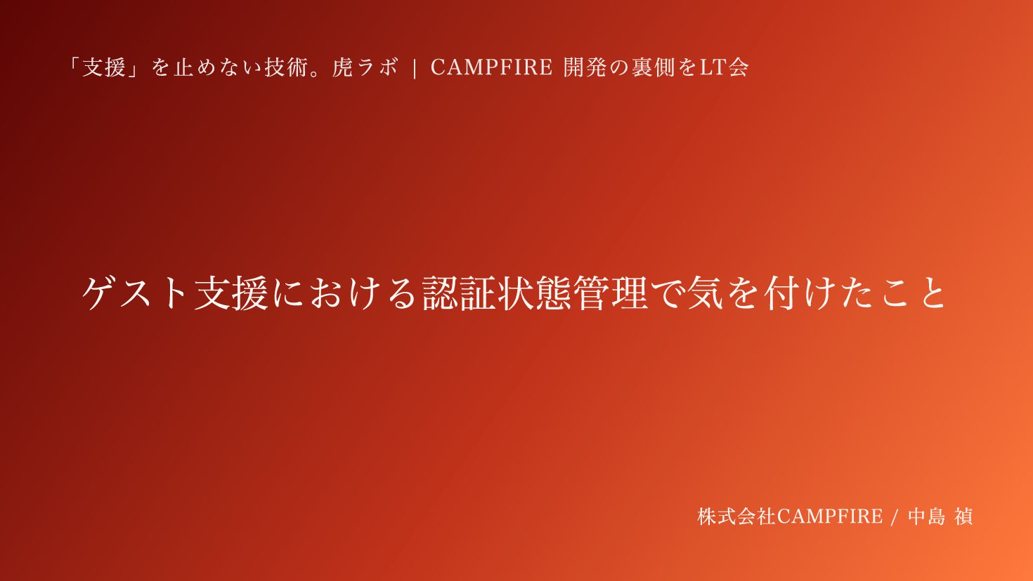 未ログイン支援における認証状態管理について 「支援」を止めない技術。虎ラボ | CAMPFIRE 開発の裏側をLT会 ゲスト支援における認証状態管理で気を付けたこと 株式会社CAMPFIRE / 中島 禎