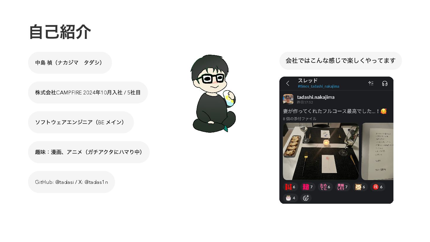 ソフトウェアエンジニア(BE メイン) 趣味:漫画、アニメ(ガチアクタにハマり中) GitHub: @tadasi / X: @tadas1n 会社ではこんな感じで楽しくやってます