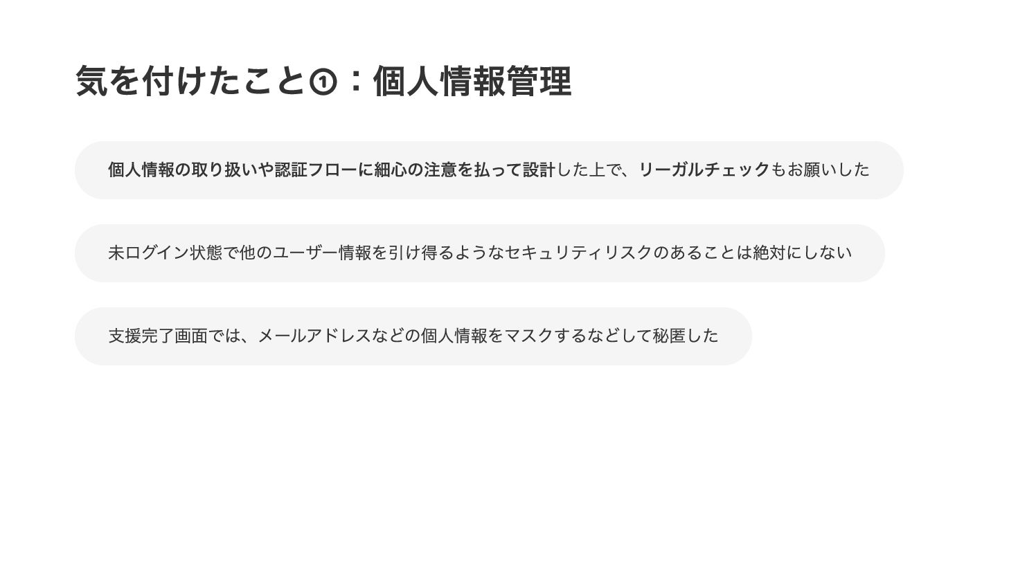 気を付けたこと①:個人情報管理 個人情報の取り扱いや認証フローに細心の注意を払って設計した上で、リーガルチェックもお願いした 未ログイン状態で他のユーザー情報を引け得るようなセキュリティリスクのあることは絶対にしない 支援完了画面では、メールアドレスなどの個人情報をマスクするなどして秘匿した