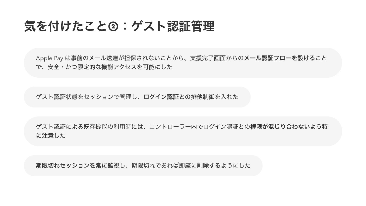 気を付けたこと②:ゲスト認証管理 Apple Pay は事前のメール送達が担保されないことから、支援完了画面からのメール認証フローを設けること で、安全・かつ限定的な機能アクセスを可能にした ゲスト認証状態をセッションで管理し、ログイン認証との排他制御を入れた ゲスト認証による既存機能の利用時には、コントローラー内でログイン認証との権限が混じり合わないよう特 に注意した 期限切れセッションを常に監視し、期限切れであれば即座に削除するようにした