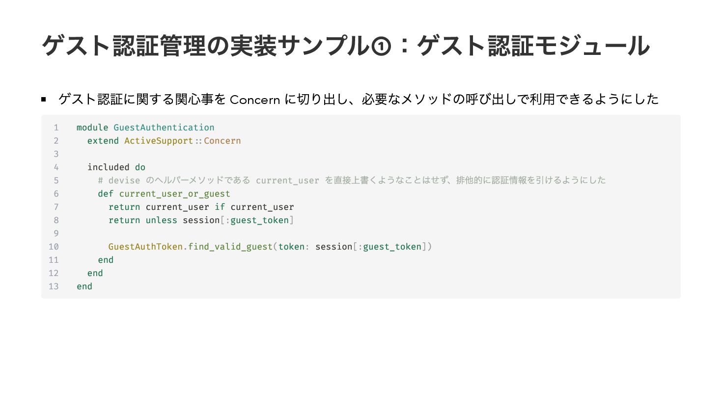 ゲスト認証管理の実装サンプル①:ゲスト認証モジュール ゲスト認証に関する関心事を Concern に切り出し、必要なメソッドの呼び出しで利用できるようにした 1 module GuestAuthentication 2 extend ActiveSupport::Concern