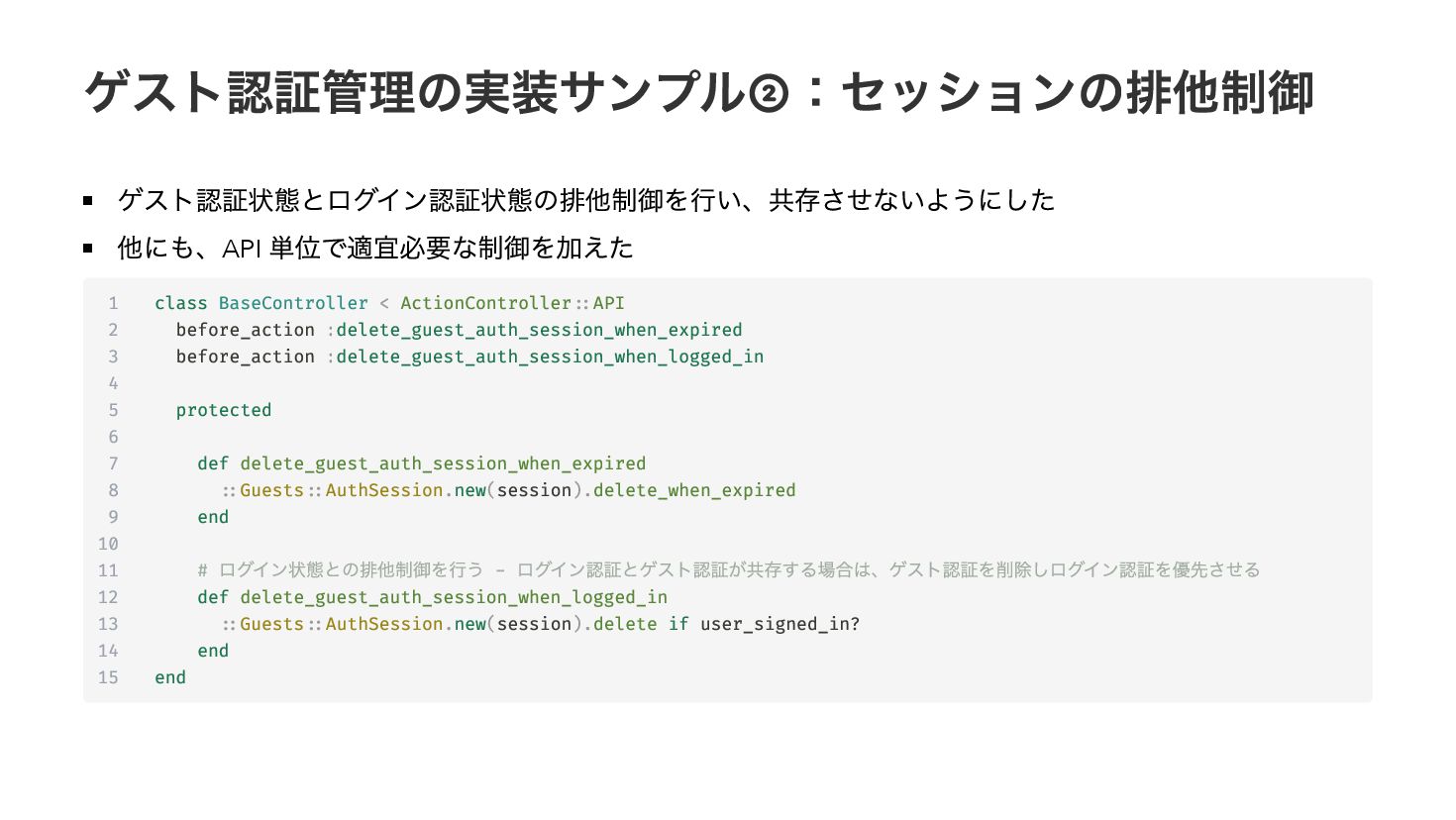 ゲスト認証管理の実装サンプル②:セッションの排他制御 ゲスト認証状態とログイン認証状態の排他制御を行い、共存させないようにした 他にも、API 単位で適宜必要な制御を加えた 1 class BaseController < ActionController::API 2
